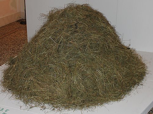 Guidati dal rumore costante del martello sull'incudine, entriamo nella sezione conclusiva della mostra: Gesti Fieno Saperi. In un'atmosfera raccolta, le citazioni agresti riportate sui pannelli ci accompagnano fino all'odoroso covone di fieno ottenuto dall'antica pratica dello sfalcio, come illustrato nella proiezione.