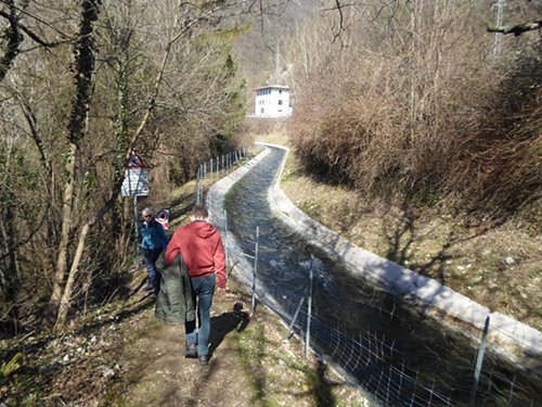 Eravamo a circa metà altezza. Alla nostra destra cadeva l’acqua del torrente Torre, che l’ingegno di Arturo Malignani, tra la fine dell’Ottocento e primo Novecento, ha sfruttato attraverso la costruzione di una diga e relativo bacino. La cascata Crosis è artificiale: con i suoi 38 metri sembra essere la più alta cascata artificiale d’Italia.