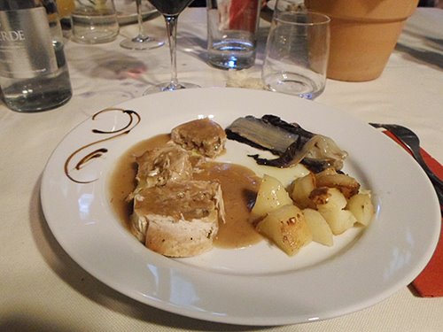 Rotolo di Tacchino farcito alle erbe e salsiccia. Radicchio stufato e patate rosmarino