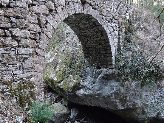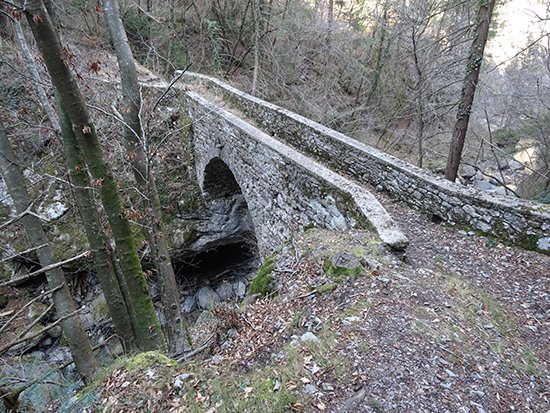 Eccolo!!! un piccolo gioiello che ha resistito alle vicissitudini del tempo,dicono di epoca medioevale che serviva le comunità limitrofe per recarsi ai mulini, dove i contadini portavano la "siale" segale, il "sorc" granoturco e altri cereali a macinare.Un arcata del ponte è appoggiata su un grosso masso, con mia sorpresa è stretto, probabilmente ci passavano solo a piedi o a dorso di un animale.