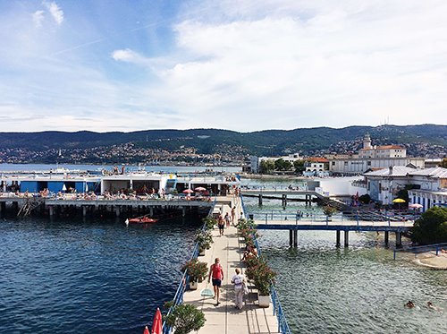 Un consiglio pratico: per chi vuole stare tranquillo, è preferibile andare nelle prime terrazze, perché le ultime sono territorio degli adolescenti: qui si ride, si urla, si sente la musica e si fanno i tuffi. Dopo le dieci terrazze, i bagnanti continuano a popolare tutta la strada fino al Castello di Miramare. Insomma a Trieste si trovano bagni per tutti i gusti e l’esperienza di fare un bagno in mare con vista sulla città è unica.