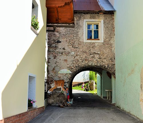 Parcheggiamo l’auto nella piazzetta di fronte alla locanda e ci incamminiamo verso il portico in pietra di casa Krahvogl, con grande sorpresa di tutti qui a darci il benvenuto c’è un gigantesco orso bruno! Si tratta di una sagoma di legno dipinta a mano che raffigura ad altezza naturale il grande animale e proseguendo il cammino ne troviamo altre, Animalborghetto infatti è un percorso in cui si possono ammirare tutti gli animali selvatici che abitano questi luoghi fedelmente ritratti: ci sono volpi, linci, caprioli e cinghiali. La passeggiata prosegue leggermente in salita, ma grazie alla compagnia di tutti questi animaletti, come per magia, nessuno dei nostri bambini, solitamente piuttosto pigrotti, si lamenta per la fatica.