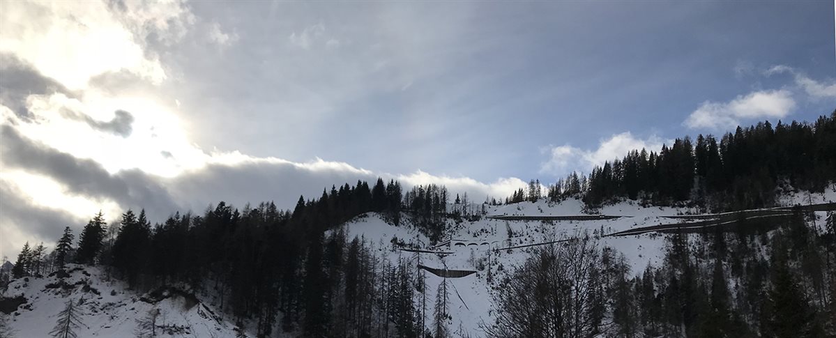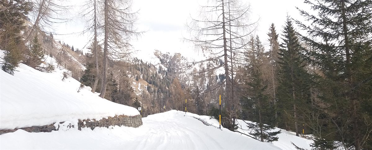 Eight bends, and then a second sign warns us as the road climbs up the rocky ridge. Ale, whom I have already rudely left some metres behind taken as she struggled with the snow, shouts to me: “Go ahead, I’ll come up at my own pace; I might just make it to the fourth hairpin!”. And mountains, and in this case even on a road, should be taken just like that: each with his own pace. And there is no irritation or resentment in her words, just as there is no remorse in my going. But I climb anyway without haste, without a clock, without a phone, without thoughts, while the white road unwinds in front of me. There are no steep slopes, and everything is just so and quiet. Silence fills the valleys, the firs and the larches without snow, which are motionless, like ancient sentinels, observing all my steps. It’s great to walk on the white snow, without too much effort, looking around. My breathing never becomes laboured and the view opens more and more, over the whole crown of the mountains that embrace the pass that divides Friuli Venezia Giulia from Cadore, the Friulian Dolomites from the Veneto. At the top a wooden bench looks at this spectacle eternally still, and for a moment I look at it with it. I breathe in the white around, which has increased as I have climbed up, then I put my feet in the snowboard and slowly follow the long white snake on the road, which brings me serenely down to the quiet valley of Sauris.