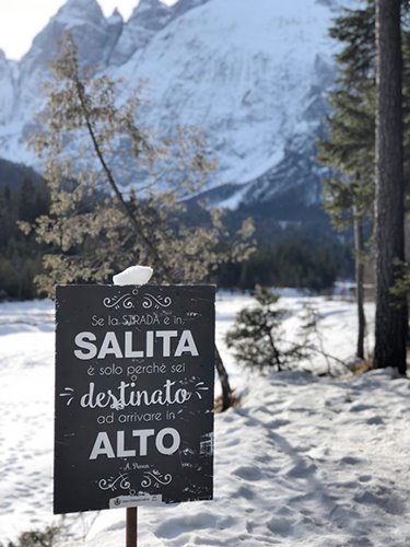 Il Saisera Wild Track è uno dei sentieri che si snodano in Val Saisera, a parer mio il più bello da percorrere nella stagione invernale. La sua particolarità sono i poster raffiguranti frasi motivazionali e citazioni sulla montagna che si possono trovare lungo il percorso. Un incentivo a scoprire l’intero sentiero, un modo per farti chiedere “cosa ci sarà dietro quella curva?” La passeggiata diventa quasi un modo per ritrovare sé stessi, per dimenticare tutti i problemi e rilassarsi davvero al 100%.