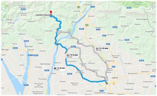 Ci si arriva seguendo le numerose indicazioni che si trovano già da Pinzano al Tagliamento, seguendo la Strada Provinciale 1, bellissima da percorrere in moto e meta anche di numerosissimi ciclisti per i suoi bei tornanti. Naturalmente dopo aver ammirato il castello non si può fare a meno di ritornare per un tratto sulla SP1 verso Tolmezzo e fermarsi lungo il torrente Arzino, che in questo tratto regala dei panorami suggestivi di cascatelle e forre scavate nella roccia.