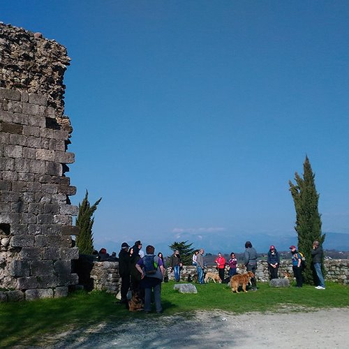“Woof, amici! Eccomi qua, il vostro Drover dalla pelliccia rossa. Oggi vi voglio raccontare del dog walking svoltosi nella “mia” Fagagna, perché io abito lì, e chi meglio di me ne può parlare? La domenica prescelta per l’uscita era bellissima con cielo azzurro da manuale! Dall’ampio parcheggio di Piazza Unità d’Italia è iniziata la passeggiata: una fila incredibile di cani e persone, come un serpente variopinto, ha cominciato a salire attraverso una vecchia strada selciata (vicolo Morcjùte e via Cecconaia) verso il Castello, del quale oggi rimangono la vecchia torre trasformata in campanile, i resti del bastione, il torrione centrale e la trecentesca Chiesa di San Michele. Da quassù il panorama era stupendo: lo sguardo spaziava sulle colline, una poiana fischiando sfruttava le correnti ascensionali e ci volteggiava sopra la testa e un picchio verde con il suo volo ondulato e la sua risata pazzerella ci è passato a breve distanza. Dopo essere ridiscesi verso la piazza, ci siamo diretti verso il Parco del Cjastenâr, un parco pubblico naturale ricreativo, molto ben attrezzato con giochi per bambini, percorsi pedonali e un bel percorso vita-salute; l’ideale per una passeggiata in relax! Qui sulla collinetta, all’ombra di un immenso cedro abbiamo fatto anche la foto ricordo. Ma non è mica tutto qui, sono moltissimi i motivi per venire a visitare Fagagna! Innanzitutto fa parte del Club de “I Borghi più belli d’Italia” (in Friuli Venezia Giulia ce ne sono ben 11!) e inoltre forse non sapete che abbiamo anche l’Oasi avifaunistica dei Quadris, dove sono stati reintrodotti la cicogna bianca e dove si tutela l’ibis eremita. Non è strano venire accolti a Fagagna da qualche cicogna che vola libera nel cielo! Merita una visita anche il Museo della vita contadina di Cjase Cocèl, ospitato in una bellissima antica casa rurale risalente al 1600, che racconta la vita quotidiana e il lavoro contadino del Friuli dalla fine ‘900 fino agli anni ’50: è bellissimo! Girando tra gli ambienti ricostruiti, la cucina, le camere, il granaio, l’aia… sembra di essere tornati nel passato e, grazie alla presenza di figuranti che eseguono diverse lavorazioni con gli attrezzi di un tempo, ci si immerge in un’atmosfera unica. Ma allora amici, cosa aspettate…venite a Feagne (Fagagna in lingua friulana), per trascorrere una tranquilla giornata tra le verdi colline del Friuli centrale!