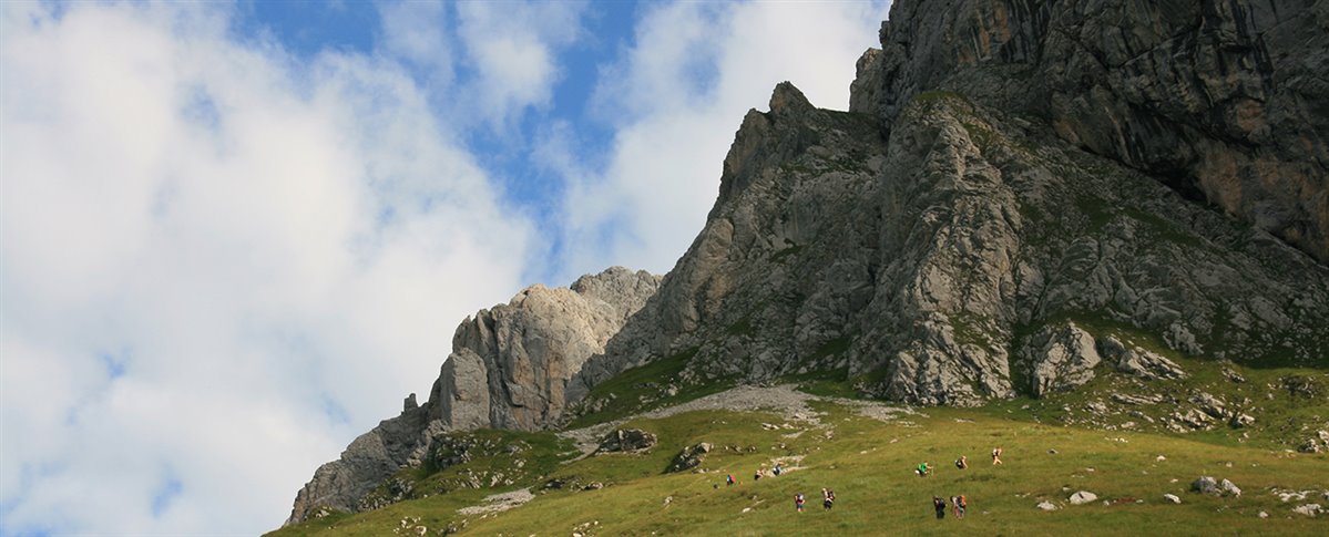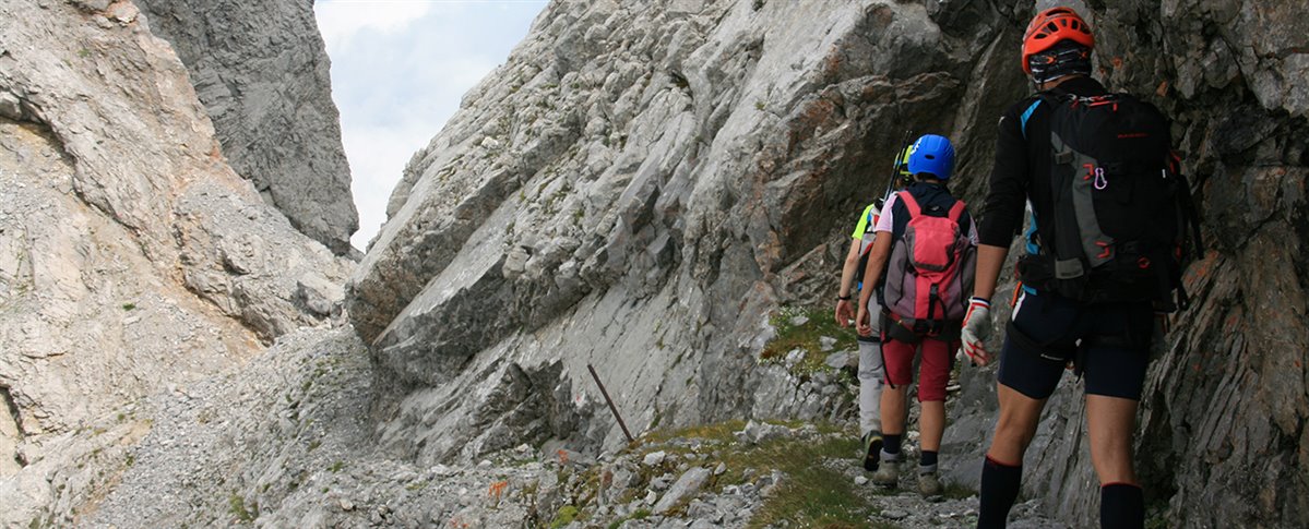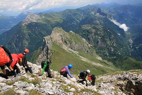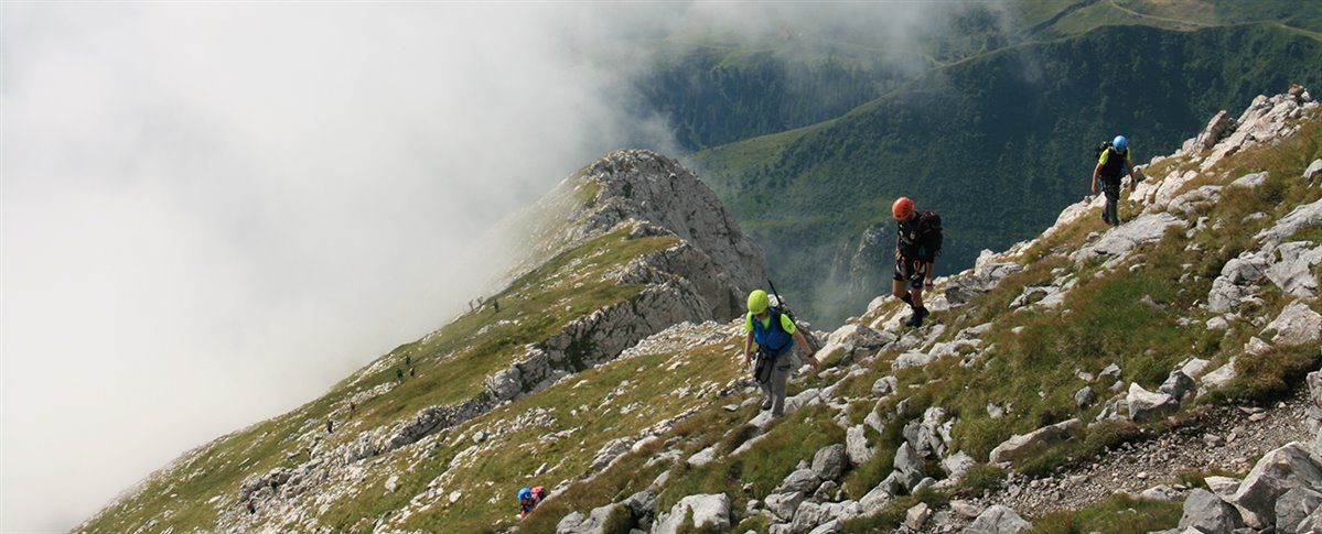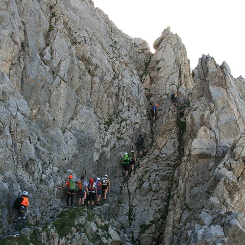 Alle 6:30 ci muoviamo, incamminandoci in direzione del Rifugio Marinelli e la via normale alla Cjanevate, oltrepassiamo la vista della bellissima Cresta Verde e dopo il bivio che porta alla “scaletta” il sentiero inizia a salire con maggiore decisione e il fondo da erboso diventa sempre più roccioso. Una sosta idrica permette di farci indossare il caschetto protettivo, l’imbrago e il kit da ferrata, necessari successivamente sulle nuove attrezzature fatte installare dalla sezione CAI di Ravascletto, rendendo il sentiero più semplice ma soprattutto sicuro.