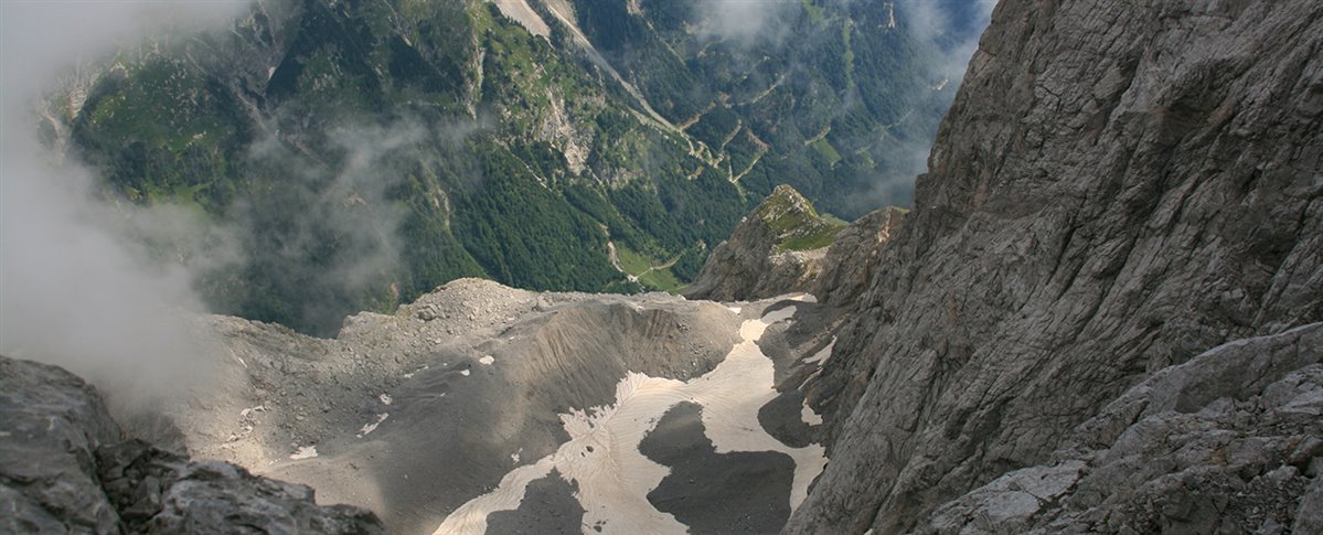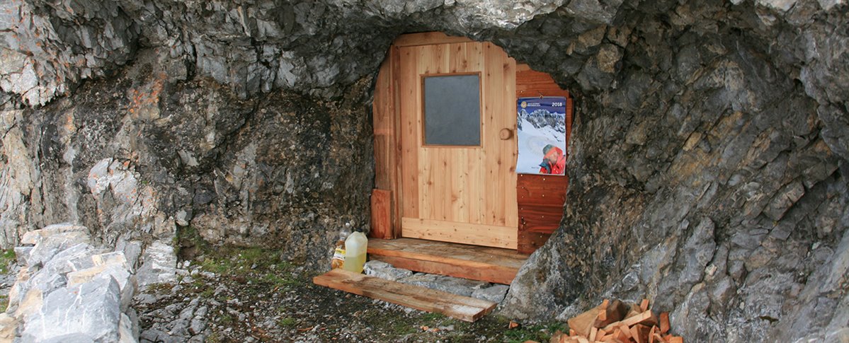 Scendiamo di quota fino a raggiungere un ricovero/bivacco ricavato nella roccia in corrispondenza di una cengia esposta che sembra essere un miraggio; c’è chi entra c’è chi solo si siede sotto la roccia al riparo dalla pioggia. La fortuna continua ad assisterci, nel bivacco è presente un alpinista locale che aveva trascorso assieme alla propria compagna la notte precedente, una persona singolare e ospitale che gentilmente ci offre un bicchiere di vino e ci racconta col sorriso interessanti storie e aneddoti della sua vita in montagna. Tra i vari discorsi ci mette a conoscenza del fatto che proprio quel giorno c’è stata l’inaugurazione del ricovero in cui ci troviamo, chiamato la Caverna dell’Amicizia “Celso Craighero” del CAI Ravascletto – Alpenverein Mauthen, nome appropriatissimo visto il clima confidenziale creatosi. Dopo risate e accenni di canti ci ritroviamo asciutti e scaldati dal sole, possiamo riprendere il cammino e scendere al Campo Base non dopo aver salutato il nostro ospitante.