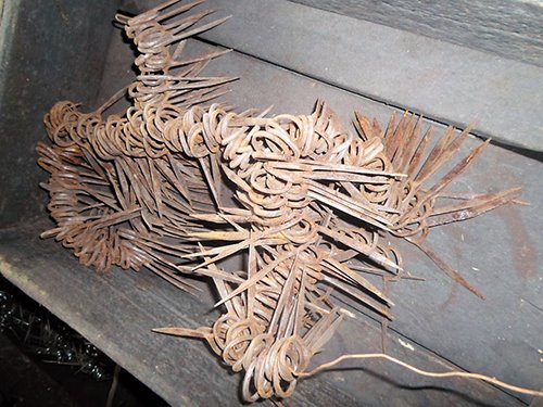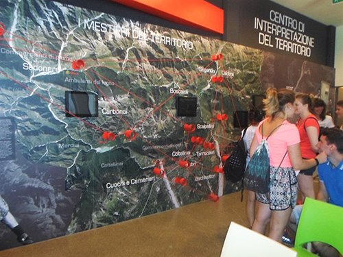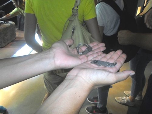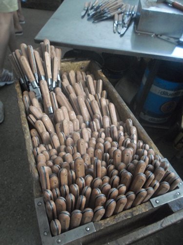 In occasione della manifestazione “Maniago, Coltello in festa” ho avuto la possibilità di visitare il Museo dell’Arte Fabbrile e Coltellerie (sempre aperto dal lunedì alla domenica): si tratta del primo opificio manifatturiero delle lame, ora simbolo di storia e di identità culturale. Al piano terra la ricostruzione degli ambienti, dai primi battiferro e botteghe artigiane all’industria. Nella hall un’interpretazione dei mestieri del territorio si colora di rosso: un mestiere che nel tempo è diventato identità del territorio colloca a Montereale i camerieri, a Polcenigo i cuochi, a Cimolais i gelatai. Mappa del territorio Storie di emigrazione, economia che trasforma il territorio. Nel laboratorio dove l’artigiano come un mago operava, pochi utensili, il fuoco, l’acqua. La materia grezza si lasciava forgiare, trafilare, molare, in lame di ogni tipo, coltelli, attrezzi rurali, casalinghi, forbici, armi, turbine per aerei, e quant’altro il mercato commissionava, pure per spettacoli e film storici come Breaveheart. La necessità di portar acqua per scopi agricoli, fa sviluppare opifici, vede la nascita della roggia di Maniago nel 1454. Nel Medioevo Maniago era già capitale di lame. Un’evoluzione continua di apertura e occasione di lavoro. Come età-lavoro ancora nell’800 si cominciava presto, in famiglia o nell’opificio. Una lama per ogni coltello, un manico per ogni lama Una storia vera: a 15 anni Carlotta aveva un posto nell’opificio, a quasi 100 anni era presente al taglio del nastro che inaugurava il Coricama Museo. Carlotta è l’emblema del ruolo femminile nel fabbrile. Durante la visita ho toccato i pezzi grezzi, immaginato quella colla di pesce su bobine dove era attaccata la polvere a smeriglio: grossa, media, fine, secondo i diversi passaggi di abrasione. Forbici grezze Si dice “coltelli” ma è un mondo di lame che scopriamo! Nei successivi laboratori di Maniago Libero ho viaggiato indietro nel tempo di generazioni: muri anneriti, stanze piene di materiale oggi. Il lavoro manuale dell’artigiano avviene con macchine, richiede ancora tanto tempo, ruoli fissi tra maschile e femminile. 50 ore e più per una forbice che tagli il filo di seta!  Solinger è un marchio tedesco noto tra le forbici. Sapevate che la manifattura-prima partiva da Maniago? Nelle 100 ditte fabbrili in vita oggi il lavoro è portato avanti da giovani, secondo progetti informatici avanzati. Il computer è affiancato anche ai telai, alle matasse, nel Museo Arti Tessili vicino al Coricama, con corsi internazionali. La visita continua a Palazzo Attimis, poi in Piazza e per le vie in festa, occasione per incontrare le aziende del distretto e assistere ad alcune lavorazioni, assaggiare le specialità e i prodotti tipici: la cipolla di Cavasso o della Val Cosa, la pitina, le birre artigianali di Cavasso Nuovo, i formaggi, elaborati con cipolla rossa o con i fichi, divertendosi. Cesto di coltellini