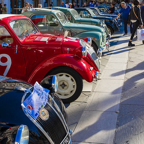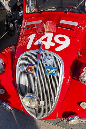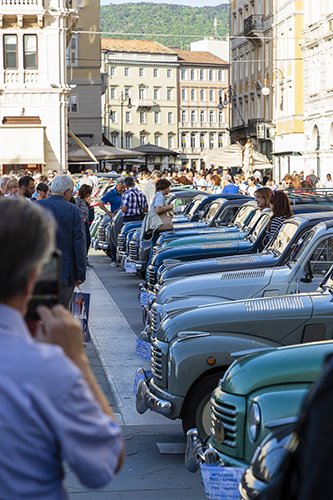 Un percorso di circa 300 km si snoda lungo il confine italo-sloveno ed è teatro dell’itinerario che le storiche vetture muovono lambendo i luoghi della Grande Guerra. Cofano di una “Topolino” Da Caporetto (Kobarid, Slovenia) al castello di Miramare, le quaranta Topolino giungono a Trieste nella celebre piazza Unità d’Italia. Qui, sotto la volta di un cielo azzurro, a primavera inoltrata, palazzi illustri fanno da cornice agli svariati colori delle auto leggendarie. Sostano, di fronte agli occhi appassionati dei loro proprietari, dalle 12 alle 18, rendendo più curiosa e pittoresca la piazza principale del capoluogo della nostra suggestiva regione. Dive d’altri tempi, attirano gli sguardi curiosi dei passanti che si soffermano ad ammirarne le forme. Prospettiva delle “Topolino in sosta” Nel tardo pomeriggio riprendono il cammino sfilando, ordinate, verso il molo Audace. Lasciano nell’aria, tra la gente che le osserva ripartire, tutto il loro fascino e una sottile nostalgia. Le storiche Topolino vanno quindi verso Palmanova. Qui, in piazza Grande, fanno bella esposizione di loro. Dalla città a forma di stella ripartono per terminare il loro percorso a Castions di Strada lungo la via Napoleonica. Trieste, molo Audace A disegnare il cammino, in accordo con l’Automotoclub storico italiano, è il Topolino autoclub Italia, nato nel 1977 a Bologna.