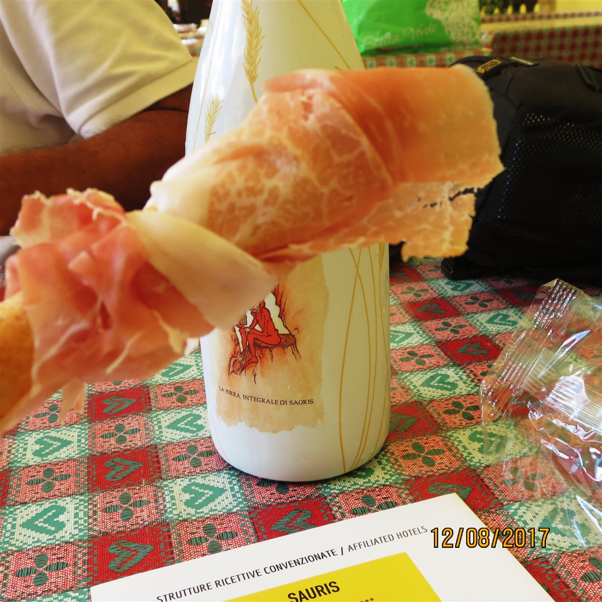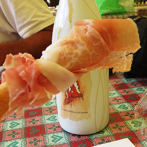 È stupefacente mettersi alla ricerca di una cosa e strada facendo rendersi conto che forse era destino non trovarla perché il tuo interesse è stato più attratto da altre meraviglie. Cercavo infatti la fava di Sauris e così un sabato ho deciso di fare un giretto da quelle parti; imbocco la stretta stradina di montagna non molto idonea ad un impacciata guidatrice come me, tornanti, gallerie di pietra che sembra ti portino dentro le viscere della terra, sto sulle spine tutto il viaggio, intravedo il lago, mi si apre un po’ il cuore e alla fine eccomi 3 metri sotto il cielo. Sono a Sauris di Sotto, poche casette di legno milioni di gerani fioriti ai davanzali, una chiesa che svetta in cima al paese, pascoli rigogliosi mucche e tanto verde, tanta pace e un gatto che somiglia al mio Goku anche come carattere, bonaccione, avvicina ogni turista, scambia opinioni con ognuna delle tante statue di legno che ogni casa sfoggia. Eh si, è un mosaico di pupazzi di legno a cielo aperto, sembra quasi che ti chiamino, ti indichino da che parte di bosco provengono, di chi sono le mani che li han scolpiti, il paese delle favole. Le fave son passate in secondo piano, non ho potuto fare a meno di mangiare dell’ottimo prosciutto. Mi piace il Prosciutto di Sauris perché ha un leggero ricordo di fumo, come il ben più celebre speck, accompagno con un’eccellente birra artigianale integrale prodotta proprio in questi luoghi, ho comprato allo spaccio anche qualche pezzetto di formaggio di malga, un perfetto aperitivo consumato assieme agli altri turisti nelle panche messe a disposizione… e festa sia! Non potevo però rinunciare ad un tris di primi piatti tipici della zona, gnocchi di pane, cjarsons alle erbe, pasticcio di zucchine e salsiccia di Sauris. Quindi cercavo la fava e ho trovato prosciutti e affettati, birra, formaggi e primi piatti di ottima qualità… torno a casa con i miei acquisti e ne nascerà una ricetta che ho già in mente. La missione “fava” è fallita? No! Rimandata, perché mi è venuta una gran voglia di ritornare qui, magari qualche giorno di più per scoprire altre cose (ad esempio so che producono una trota affumicata veramente eccellente), per fare una bella camminata e dormire in questa piccola ma immensa oasi di pace.