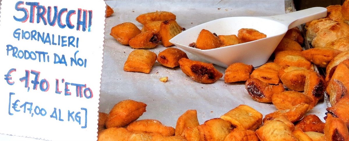 Con lo stesso composto vengono realizzati gli Strucchi, altro dolce tipico, più piccolini, una sorta di raviolo ripieno di composto, richiuso e fritto (esiste anche una variante lessata e poi condita con burro fuso e cannella): un bocconcino sfizioso per l’ora del tè.