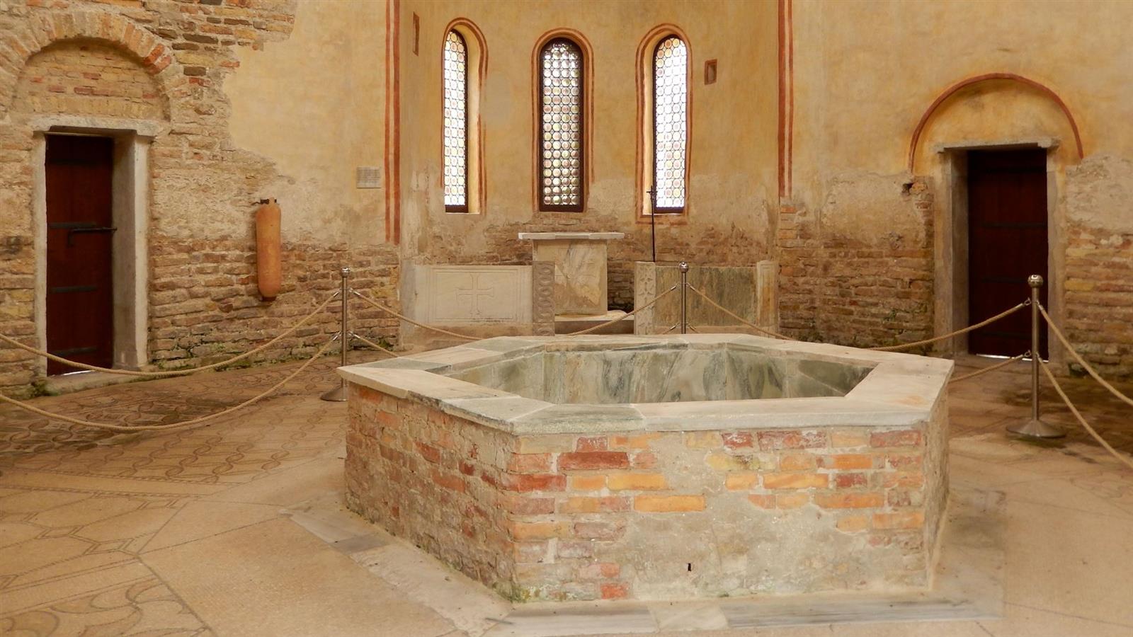Il Battistero paleocristiano di Grado adiacente alla Basilica di Santa Eufemia del VI secolo, ha forma ottagonale. È stato costruito dal il beneventano Probino (569-571) come comprovato dalla lastra frontale sull'altare dove il suo monogramma è differenziato con colombe e pavoni.