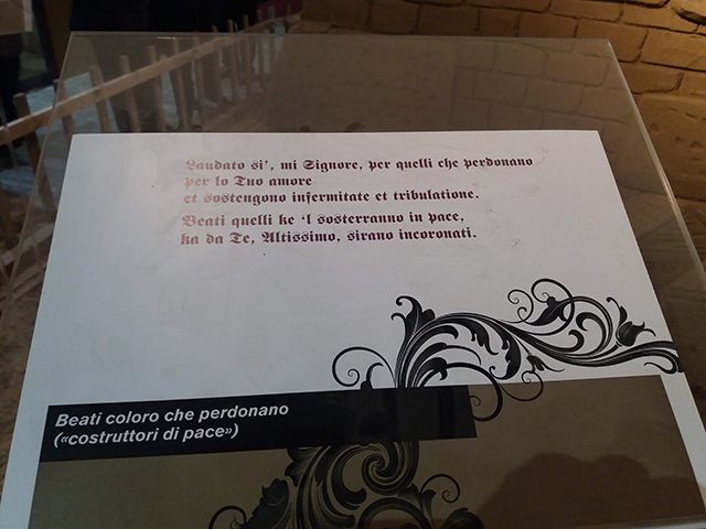 Der Rundgang zwischen den Figuren, die durch Abbildungen der Gemälde Giottos und Tafeln mit den Versen des Hl. Franziskus ergänzt sind, ist äußerst stimmungsvoll. Für den Eintritt zahlt man eine freiwillige Spende, und jeder Besucher erhält einen Zettel, auf dem er Wünsche, Eindrücke und Gedanken niederschreiben kann, die am Ende des Rundgangs an einen symbolischen Baum gehängt werden. In einer Schautafel werden die schönsten Niederschriften des vergangenen Jahres gezeigt, Friedenswünsche und Gedanken der Hoffnung, die positive Energie verströmen.