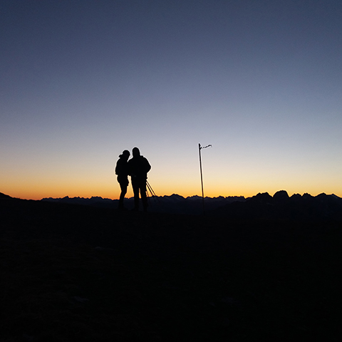 Mittlerweile ist die Sonne untergegangen, ich bin in die magische blaue Stunde eingetaucht und es ist noch hell genug, um ohne Licht weiterzufahren. In dieser einzigartigen Atmosphäre erreiche ich die Hütte. Es ist unmöglich, nicht kurz anzuhalten, der Stimme des Windes zuzuhören und das Panorama zu bewundern. Über mir das Profil der Berge, unter mir immer mehr Lichter in den Ortschaften. Und hier nur ich und mein Fahrrad.