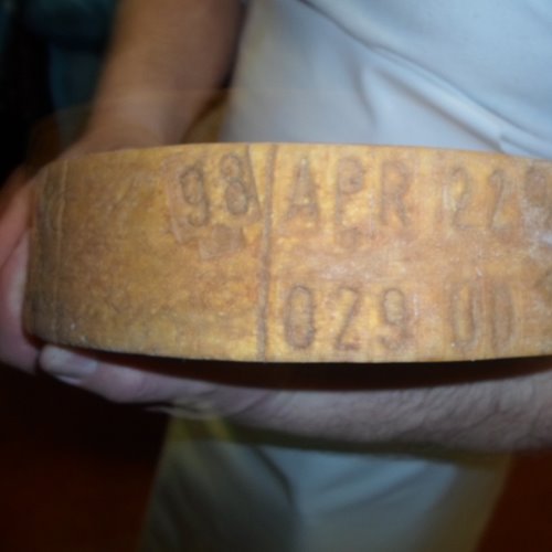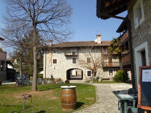 Ich werde mit einem Glas Weißwein, einem Taiut wie man auf Furlanisch sagen würde, abgelenkt, das man mir anbot, während ich las, dass das Sekretariat der Gemeinde am Vormittag unter der Nummer +39 0432 915519 für Auskünfte zur Verfügung steht. Wir nutzen unseren Besuch auch, um in der nur wenige Schritte entfernten Genossenschaftsmolkerei, die ihren Namen dem Dorf entlehnt, einzukaufen. Frische und gereifte, gebietstypische Käsesorten. Aber einen neunzehnjährigen Käse in der Form sah ich zum ersten Mal: Ein nicht mehr zu vermarktender Montasio der Sammlung vom 22. April 1998!