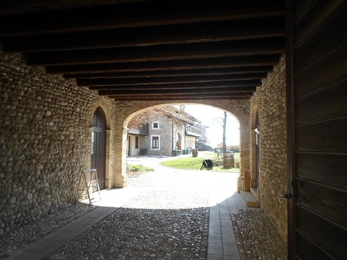 Beinahe genau gegenüber der Zufahrtsstraße zum Geburtshaus von Padre Turoldo befindet sich ein Beispiel zweier Portale, an die David M. Turoldo erinnerte ... I portici meravigliosi del nostro Friuli, ad arco oblungo, scuri e dignitosi come un portale di palazzo, aperti sulla corte o sull’orto – Die herrlichen Portale unseres Friauls, mit Spitzbögen, dunkel und ehrfurchtsvoll wie das Eingangsportal eines Palasts, gehen auf den Hof oder auf den Garten (Il mio vecchio Friuli – Mein altes Friaul). Zwei dieser offenen Portale geben heute den Blick auf zwei Wandmalereien frei. Eine bringt uns zum Großen Krieg, 1915 - 1916, zurück, die andere, die mich mehr trifft, ist ein Lebenszyklus von der Geburt bis 100 Jahre und trägt diesen Schriftzug: In terra siamo in viaggio verso la retribuzione delle opere. – Auf der Erde reisen wir für die Vergütung unserer Werke. Er erinnert mich an einen französischen Druck aus dem 19. Jahrhundert, den ich in einem Lokal in Faedis (UD) gesehen hatte und mit, übersetzt, Die Stufen des Lebens betitelt war.