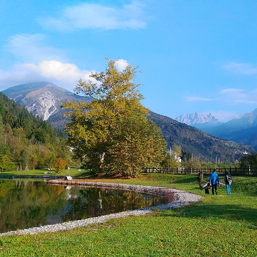 Ziel war das Holzmuseum mit venezianischem Sägewerk und zugehöriger Tierausstellung. Es war ein wunderschöner Tag mit strahlend blauem Himmel und in Herbstfarben gekleideten, umliegenden Bergen. Wir parkten beim Museum und, um uns die Beine zu vertreten, machten wir einen schönen Spaziergang zum Bachbett des Degano, um kleine künstliche Teiche herum und auf Hängebrücken über dem Quellgebiet. Wir sahen kurz einen tiefblauen Eisvogel und dann auch eine Wasseramsel auf den Bachsteinen spazieren.