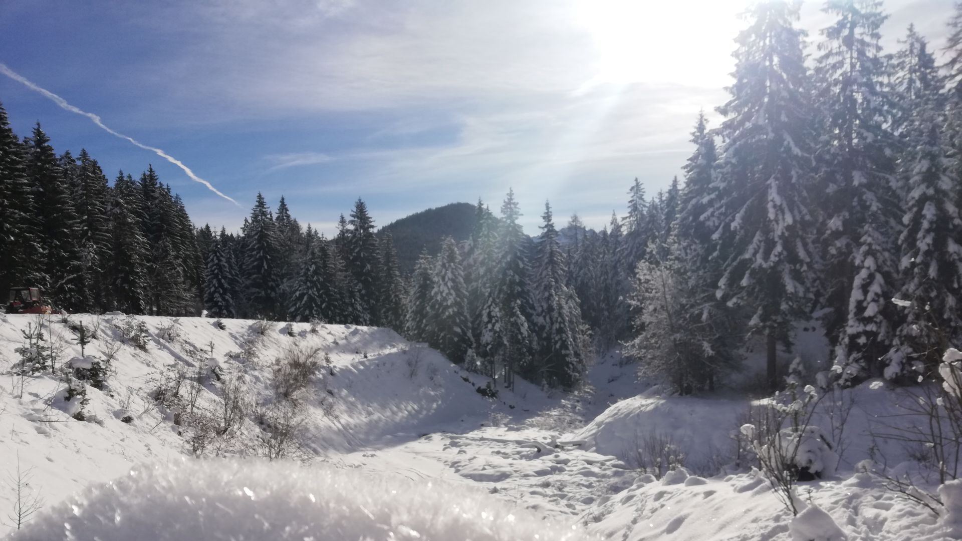 Wir haben unseren Ausflug mit der Waldstraße in der Nähe des Parkplatzes des Val Rauna auf 1090 Metern Höhe begonnen. Nach einer ca. eineinhalbstündigen Wanderung durch schneebedeckte Lärchen- und Tannenwälder haben wir uns eine kurze Pause auf der Terrasse der wunderschönen Malga Priu auf ca. 1.250 Metern Höhe gegönnt, wo wir unser Proviant verzehrt und die atemberaubende Aussicht auf den Luschariberg bewundert haben. Die Alm, die von April bis Oktober für Touristen geöffnet ist, hat außer der traditionellen Hüttenübernachtung eine weitere originelle Lösung gefunden: die umweltfreundlichen Baumhäuser in Form eines Tannenzapfens, in denen man auf zehn Metern Höhe unter den Sternen schlafen und das Panorama der umgebenden Berge auf 360 Grad bewundern kann.