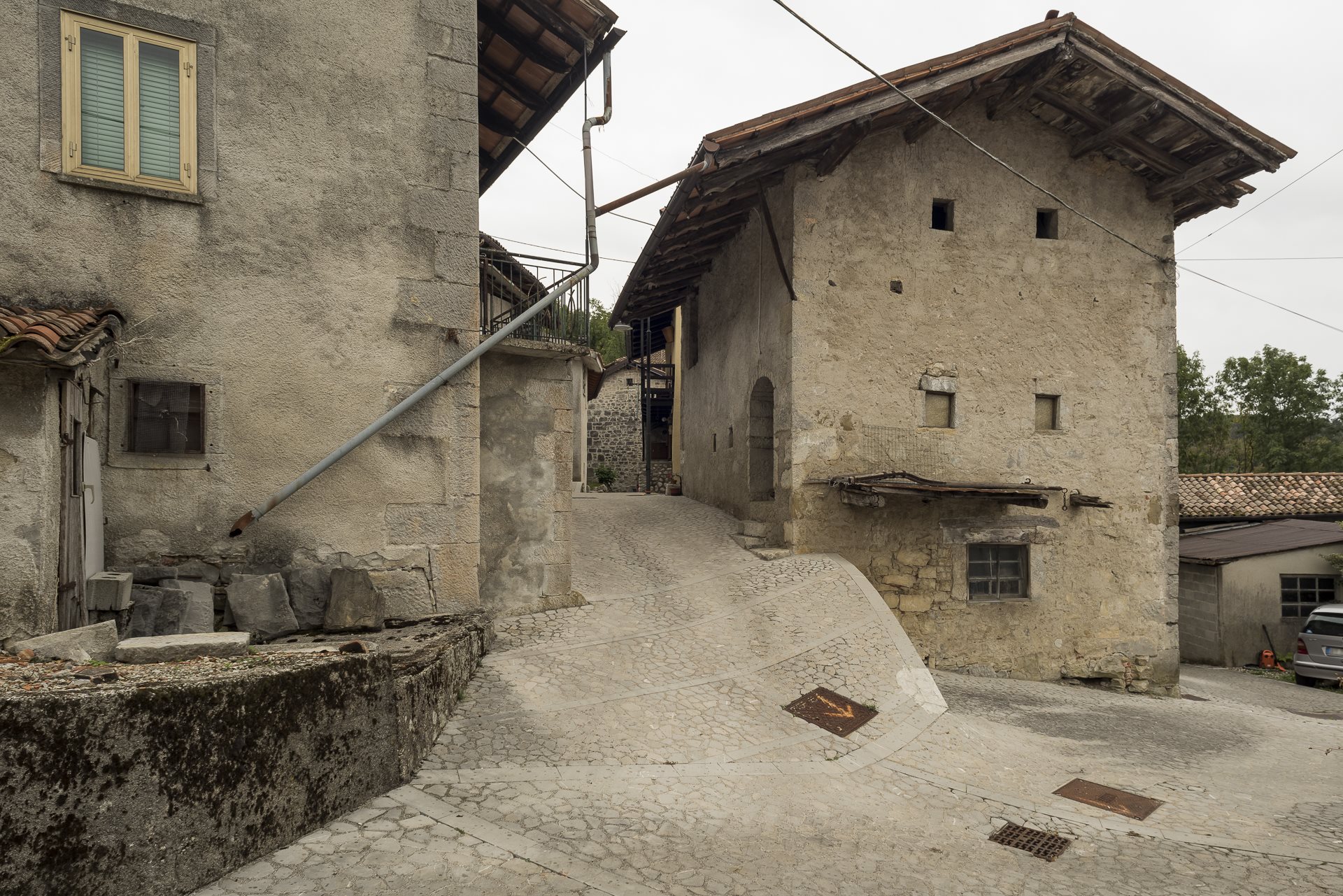 Die Siedlungsstruktur umfasst Wohnhäuser und rustikale Nebengebäude, umgeben von zahlreichen, teils jahrhundertealten Maulbeerbäumen. Bemerkenswert sind die Hofgebäude aus dem 18. Jh. im Dorfzentrum: Ein erstes Hauptgebäude in Reihe mit einer und einem langen Holzbalkon, ein weiteres Gebäude in Reihe mit einem Balkon zum Hof und eine dritte Einheit, die den Hof abschließt. Am südlichen Dorfrand liegt ein intaktes Gebäude aus drei Baukörpern unterschiedlicher Epochen, das sich über drei Stockwerke erstreckt. Die zur Talseite gerichtete Fassade ist durch kleine Fenster mit Steinpfosten gegliedert, während die zum Berg gerichtete Fassade durch eine Auβensteintreppe und einen langen Balkon unter dem Dachvorsprung geprägt ist. Einige Elemente legen eine bemerkenswerte handwerkliche Fähigkeit frei: das perfekt gefügte Mauerwerk mit "trocken" verlegten Steinen, die Steinpfosten mit gebogenem Sturz zur Lastverteilung, die polychromen verzierten Dachziegel mit Rautenmuster und das hölzerne Balkongeländer.