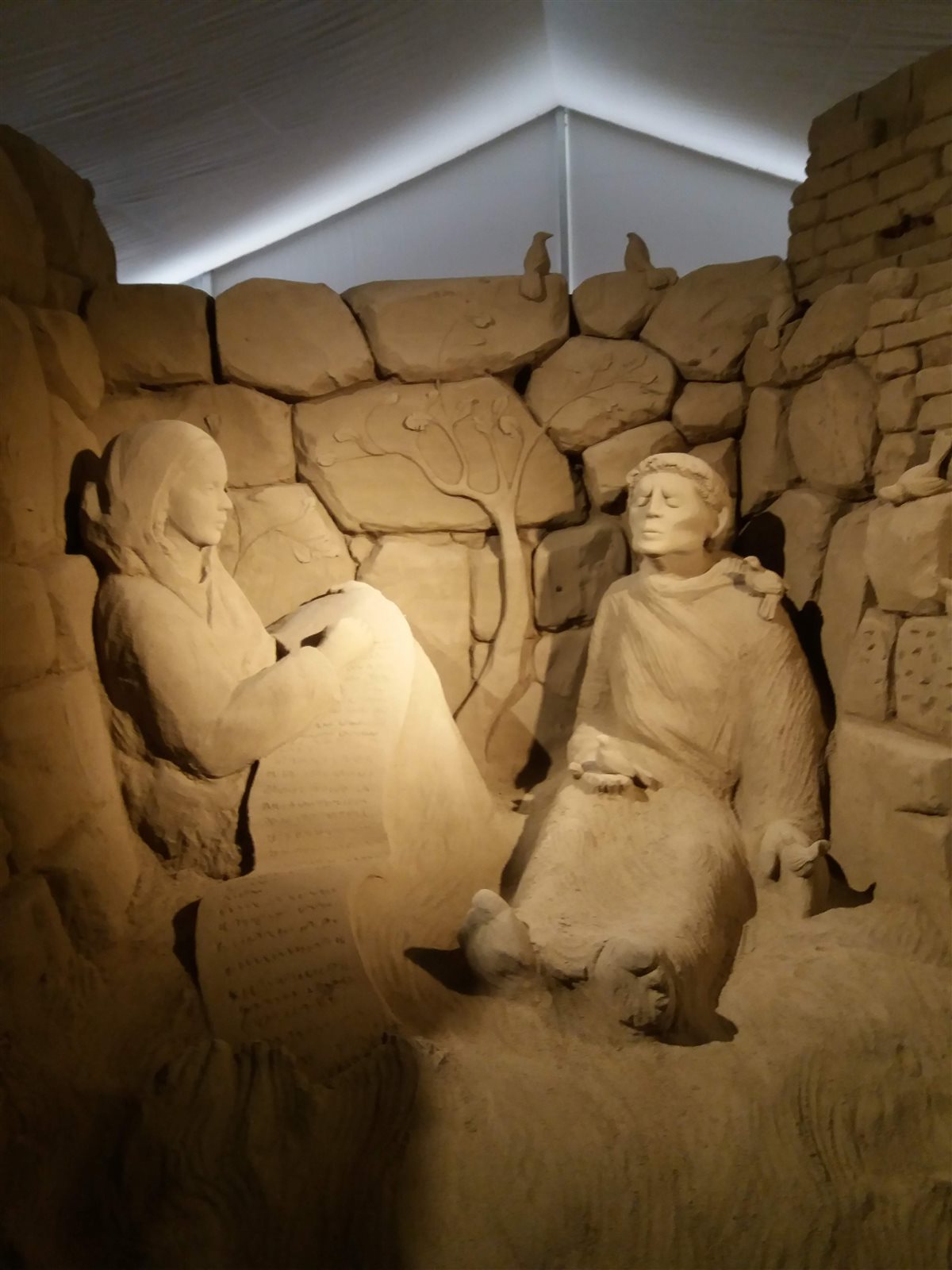 It was the first time I’d visited, and to be honest, I didn’t expect much; but the sight in front of me was really beautiful and moving. Inside a large marquee placed in front of the Terrazza a Mare, close to Office 4, is a path between sand sculptures representing the Nativity, made by Sand Academy artists from all over Italy.