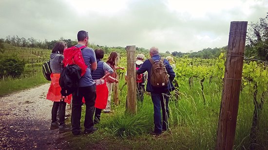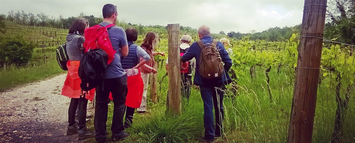 Decido poi di deviare dal percorso ufficiale e prendo una stradina che sale addentrandosi nel bosco che profuma di robinia. Il sentiero corre proprio in cima alle colline coltivate a vigneto dall’azienda che ci ospiterà per il pranzo/degustazione.  Proprio qui, in mezzo alle vigne abbiamo appuntamento con la proprietaria, con la quale faremo quattro passi tra i filari. Nell’attesa approfitto per far vedere una stratificazione di Flysch (o ponca) molto evidente e dare un po’ di nozione geologiche- climatiche sul Collio.  Finita la passeggiata guidata e l’interessante spiegazione sulla coltivazione naturale del vigneto, arriviamo alla sede dell’azienda, dove ci aspettano per il pranzo.
