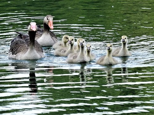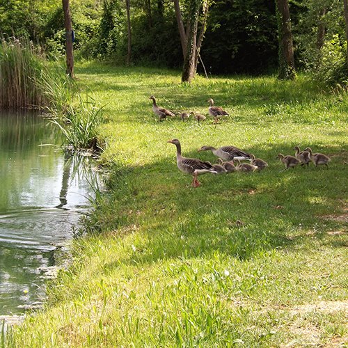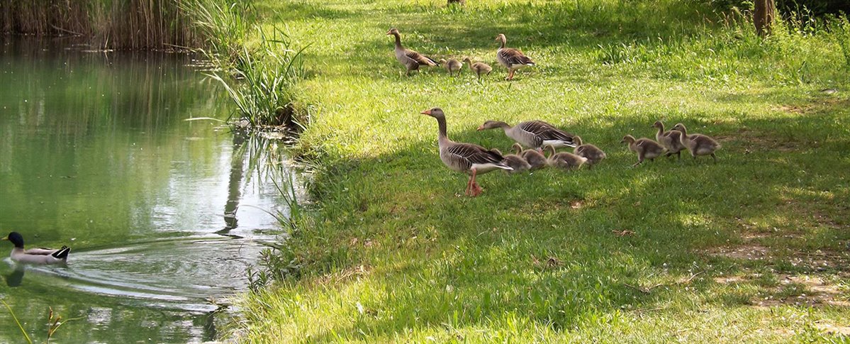 Alle ore 14 riprendiamo il cammino sull’Alpe Adria Trail attraversando molto silenziosamente e con macchina fotografica alla mano l’area naturalistica denominata Parco dei Laghetti Rossi, dove incontriamo quattro famigliole di oche grigie che, come ogni anno, nidificano in questo sito e sembrano abituate alla presenza umana, a differenza delle tartarughe d'acqua, circa una decina, che, rilassate al sole, si tuffano immediatamente in acqua non appena si accorgono di noi.  Sullo specchio d’acqua, dei laghetti, una pittoresca distesa di ninfee non ancora sbocciate.