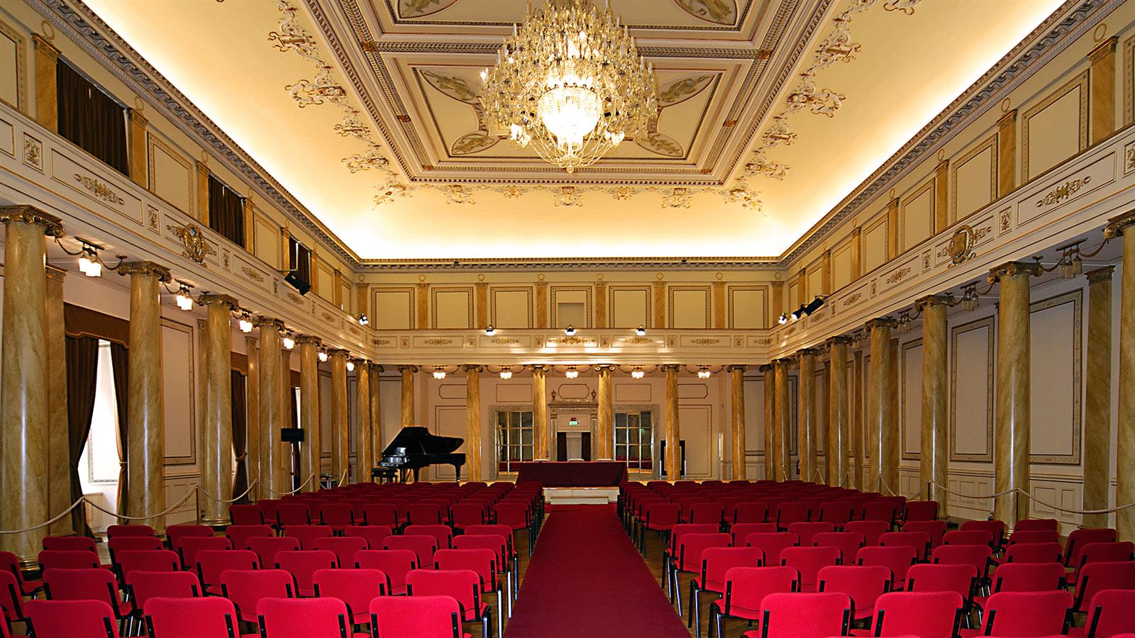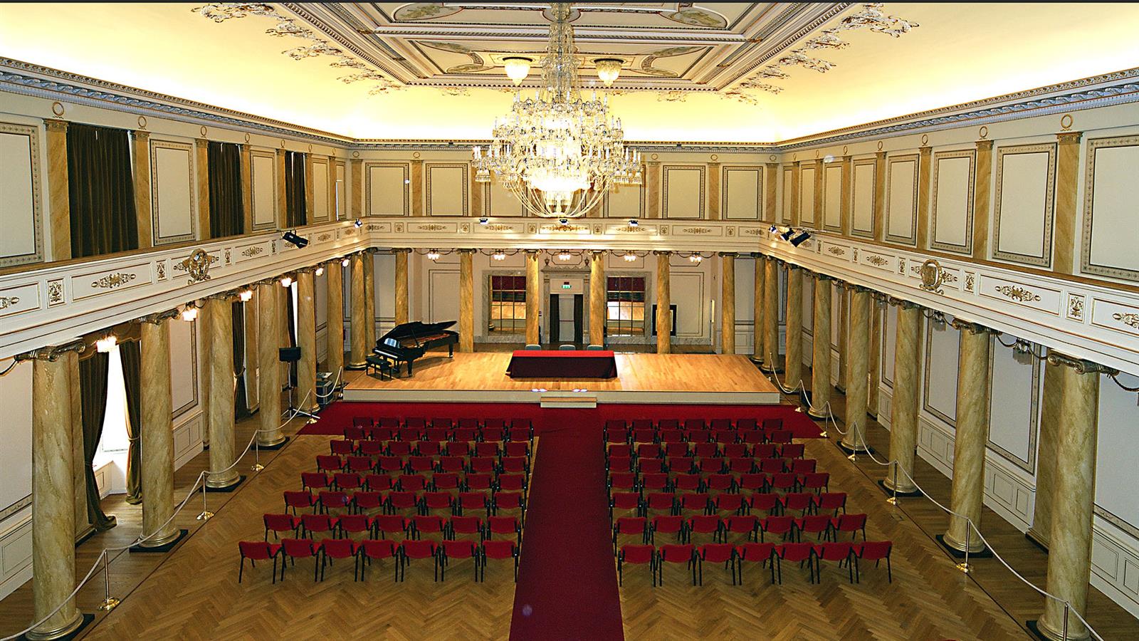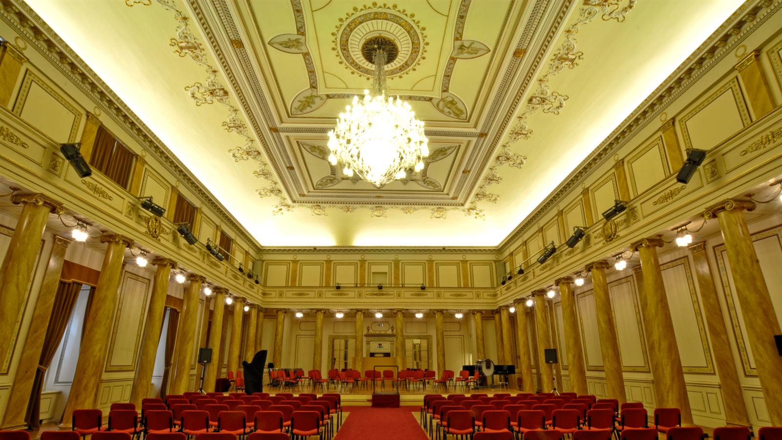 Inside, the main hall with a capacity of 1300 seats and a foyer, originally “ballroom”, that develops over two levels with a majestic peristasis of ionic columns upon which the loggia lies.
