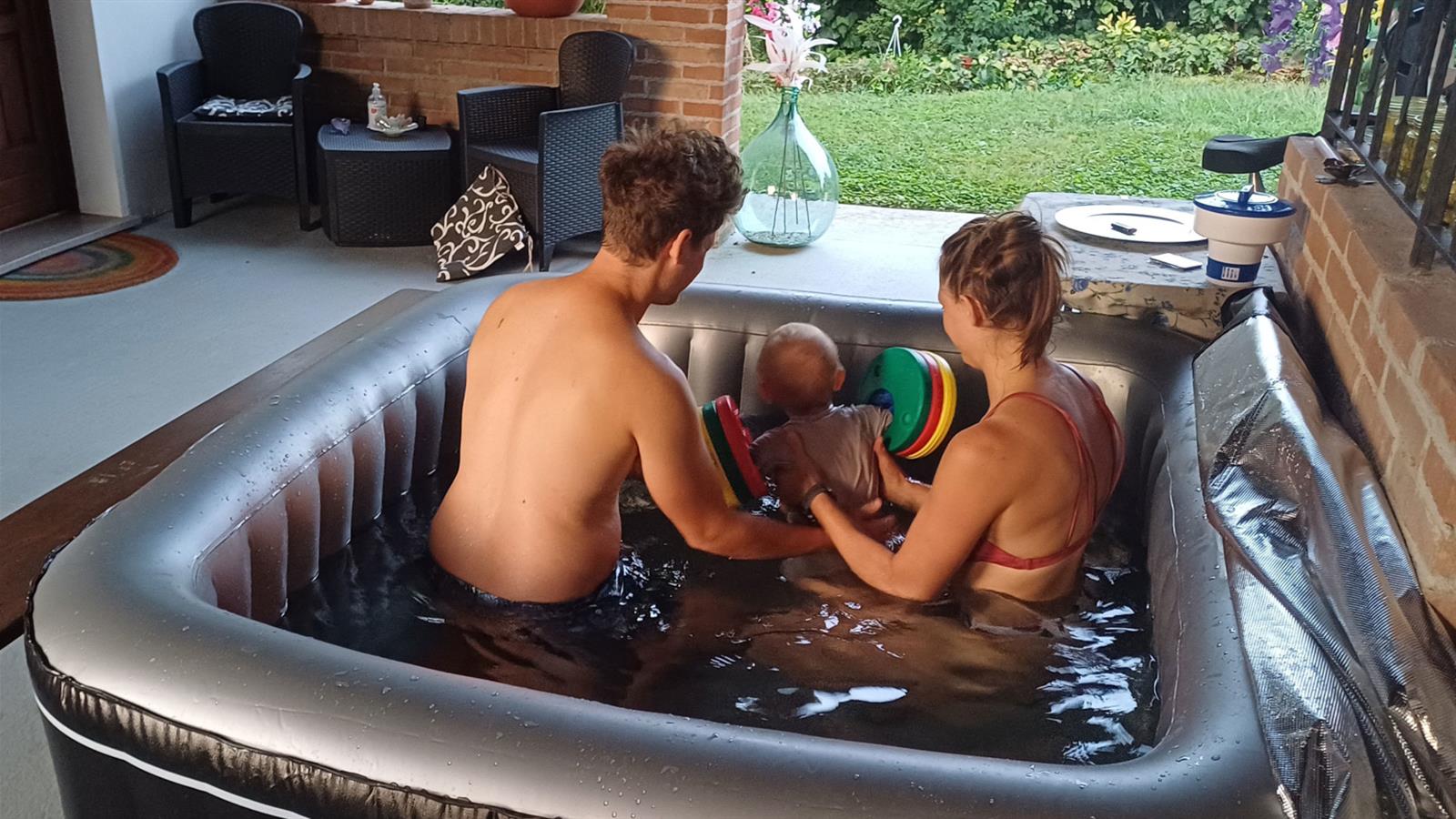 Under the covered, heated patio—protected in all seasons—you’ll find a hydromassage tub for up to six people, reserved exclusively for our guests. It’s the perfect place to relax with others or enjoy a quiet moment alone, pampered by bubbles and warm water.