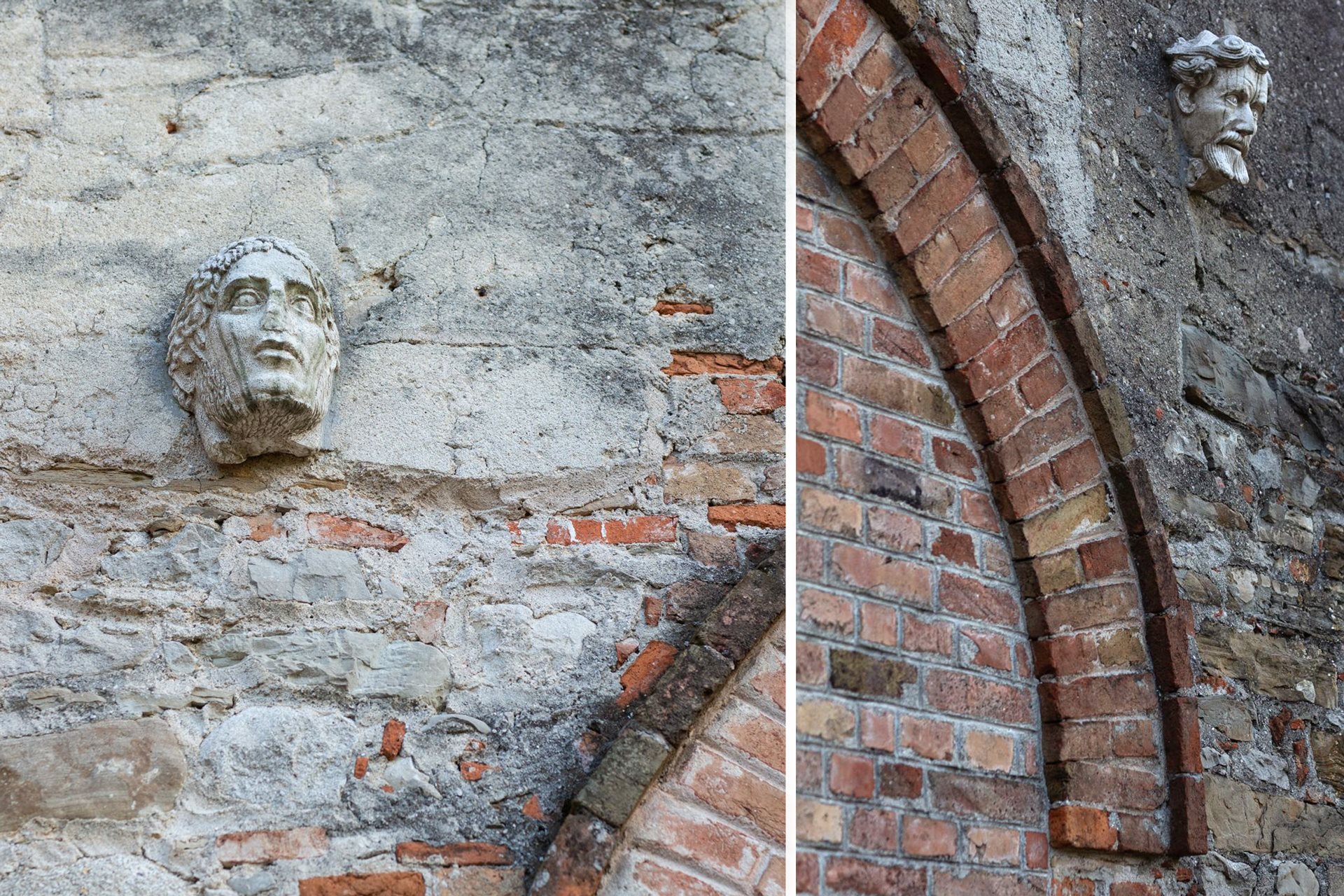 The first part, which dates back to the original castle structure, features a stone and brick base with two circular corner elements and a square tower. The tower's openings include single-lancet windows with pointed and round arches, along with small slits. The tower's top part is decorated with a triforium and an entrance portal on the south side. Below the impost level of the top floor, the original decoration includes small brick arches.