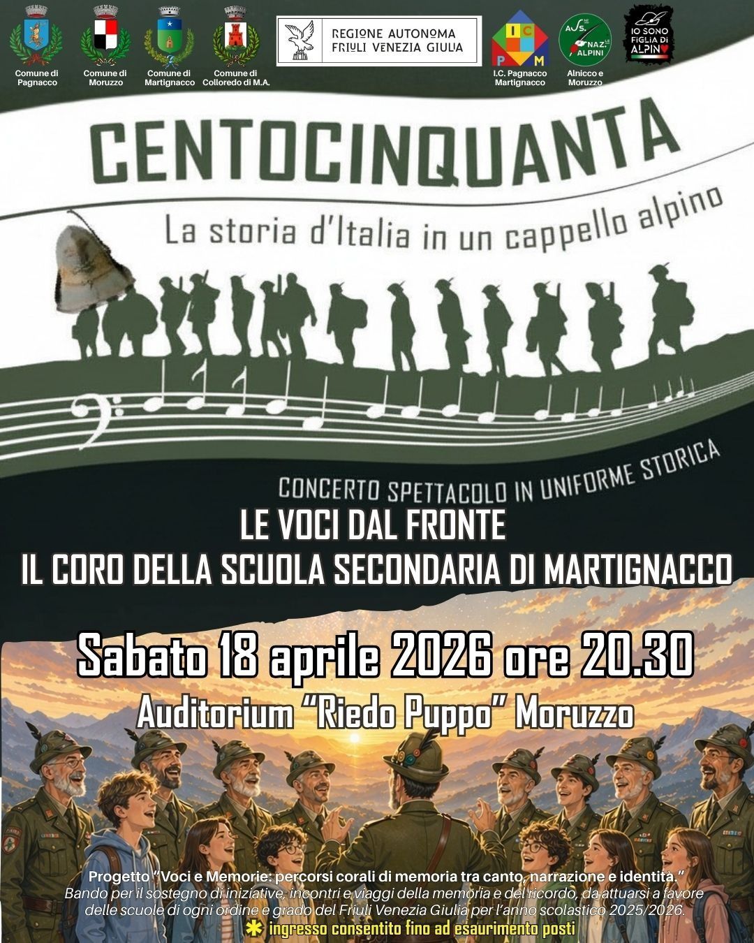 Lo spettacolo, con Le Voci dal Fronte “coro e rievocazione” in uniforme storica, sarà reso ancora più significativo dalla partecipazione dei ragazzi del Coro della Scuola Secondaria di Martignacco, che saliranno sul palco per cantare insieme in alcuni brani, in un simbolico passaggio di testimone tra passato e futuro.
