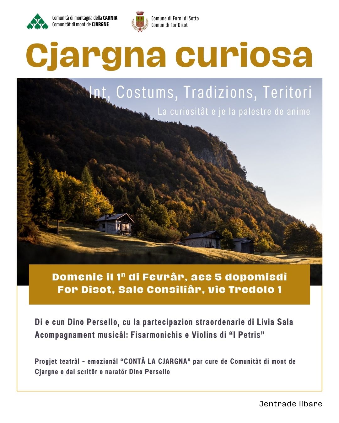 Terzo appuntamento di "Cjargna curiosa", una serie curata dallo scrittore e narratore Dino Persello, organizzata dalla Comunità di montagna della Carnia con la collaborazione dei Comuni di volta in volta ospitanti, nell’ambito di un progetto di racconti teatrali - emozionali e musicali - su genti, varianti linguistiche locali, luoghi, tradizioni, episodi, curiosità, attrazioni dei territori delle comunità carniche.
