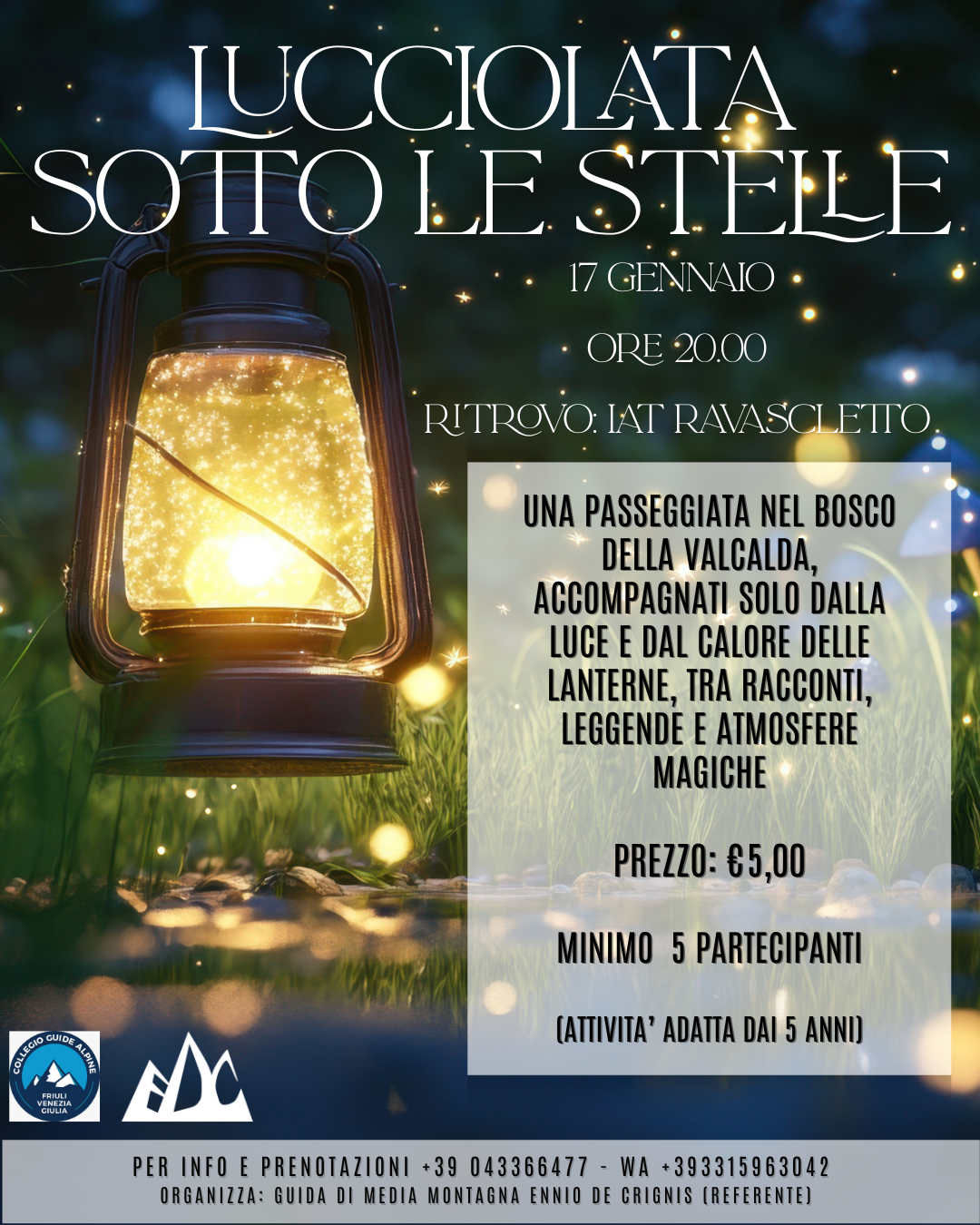 Costo 10,00 € a persona (noleggio lanterne e ciaspole inclusi), richiesta prenotazione.