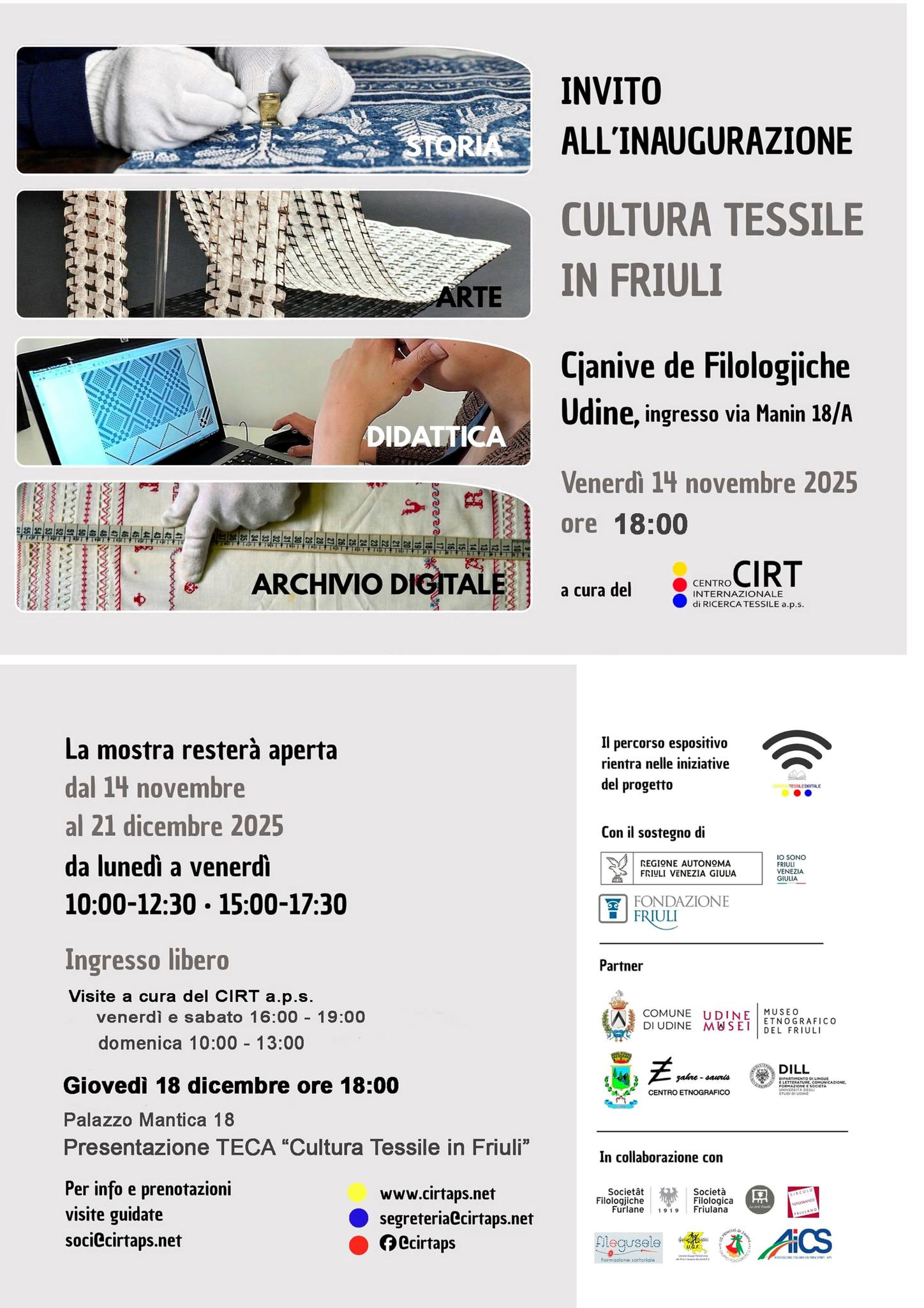 Dal 14 novembre al 21 dicembre 2025 la Società Filologica Friulana ospita nella cjanive, lo spazio espositivo di Palazzo Mantica in via Manin 18/a, la mostra Cultura tessile in Friuli promossa dal CIRT - Centro internazionale di ricerca tessile.