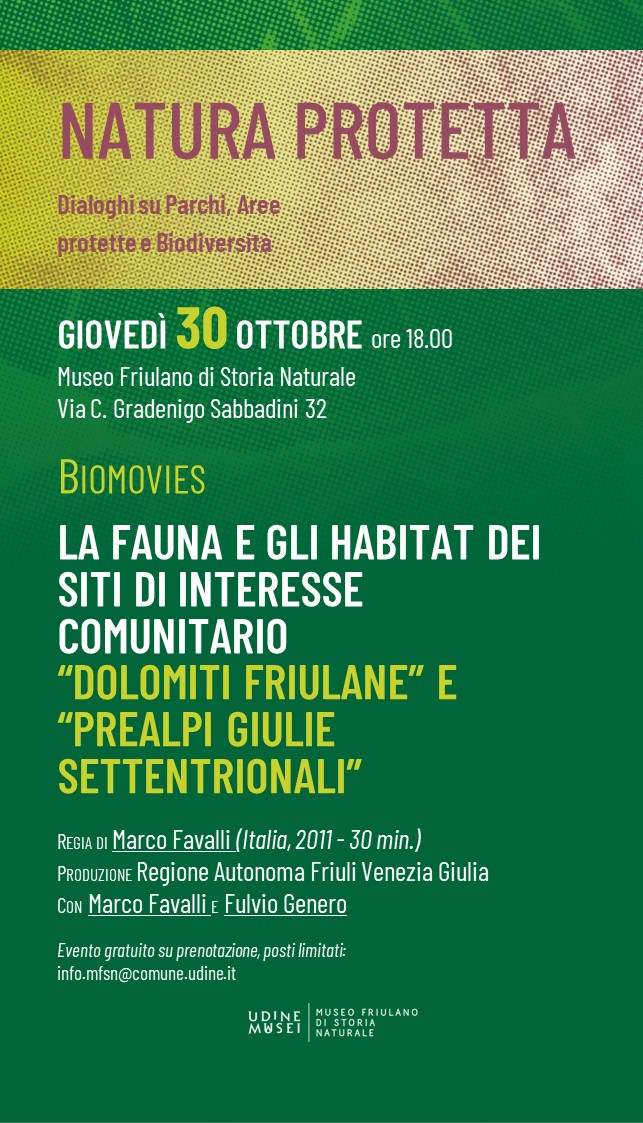 Evento all'interno della rassegna autunnale Museo e Territorio proposta dal Museo Friulano di Storia Naturale. Quest'anno il tema su cui si concentreranno le iniziative sarà Natura Protetta. Dialoghi su Parchi, Aree protette e Biodiversità.
