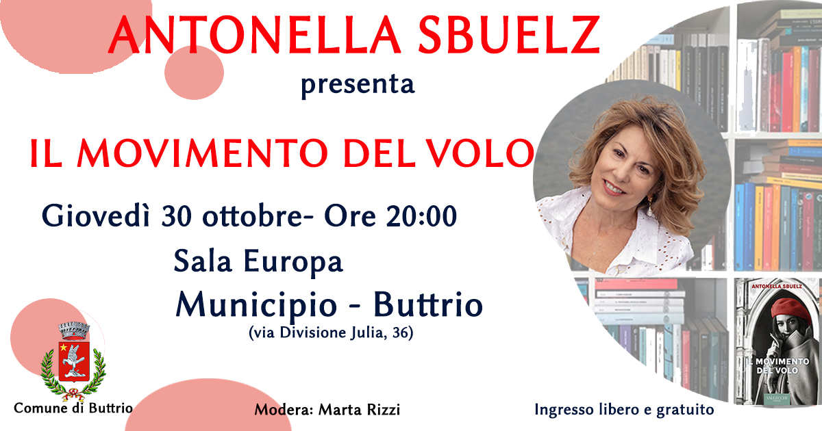Il primo appuntamento degli incontri con le autrici promosso dal Comune di Buttrio e intitolato "La Forza delle Donne" sarà giovedì 30 ottobre alle ore 20:00 in Municipio a Buttrio - Sala Europa - con Antonella Sbuelz e il suo ultimo romanzo "Il movimento del volo".
