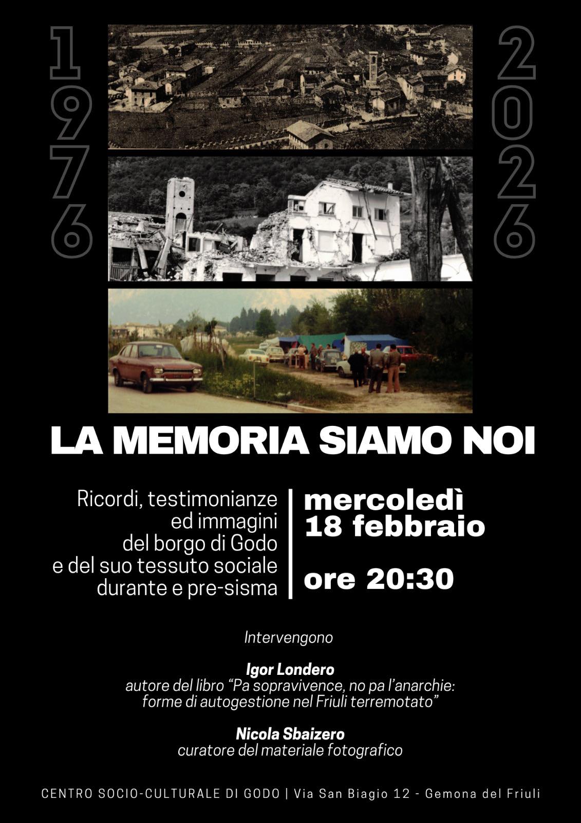 Nell’anno che segna il 50esimo del terremoto, la Borgata di Godo ha colto l’iniziativa dell’Amministrazione Comunale organizzando per mercoledì 18 febbraio alle ore 20:30 presso la sede dell'associazione in Via San Biagio, 12 una serata di approfondimento sulla nostra borgata ed il suo tessuto sociale prima e durante l’emergenza.