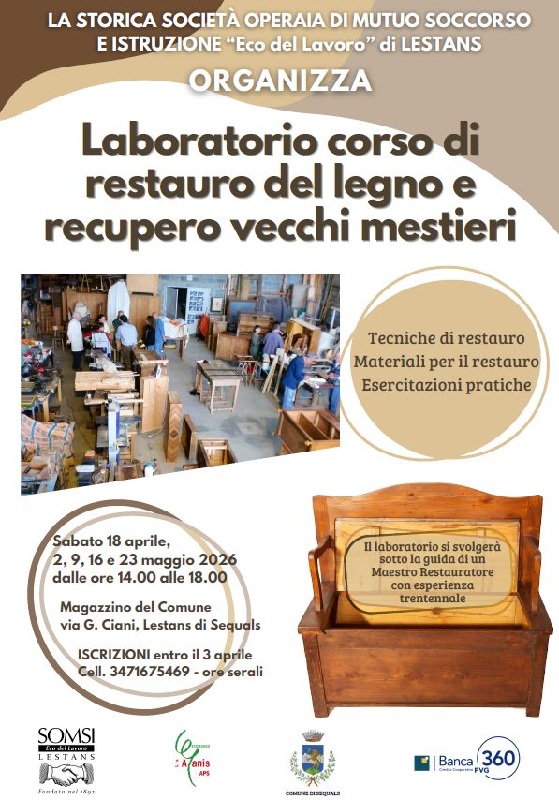 La storica Società Operaria di Mutuo Soccorso e Istruzione "Eco del Lavoro" di Lestans organizza il  Laboratorio corso di restauro del legno e recupero vecchi mestieri.