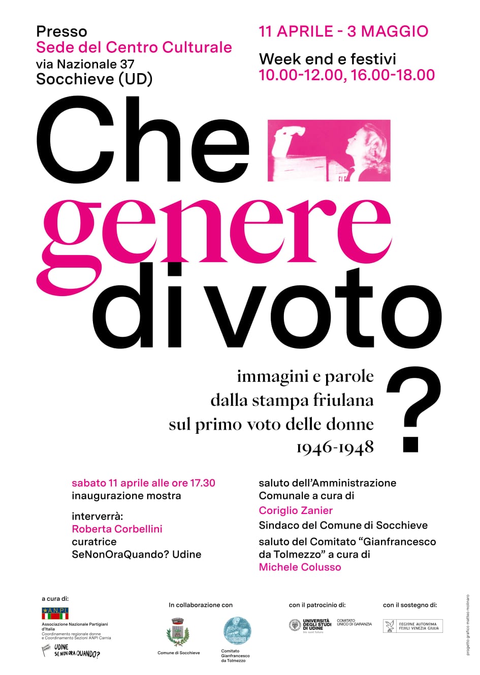 La mostra e' stata curata dal Coordinamento regionale Donne Anpi e dall’Associazione "SeNonOraQuando?" di Udine, con la collaborazione, in questa occasione ed allestimento, del coordinamento Sezioni Anpi della Carnia ed il patrocinio del Comune di Socchieve.
