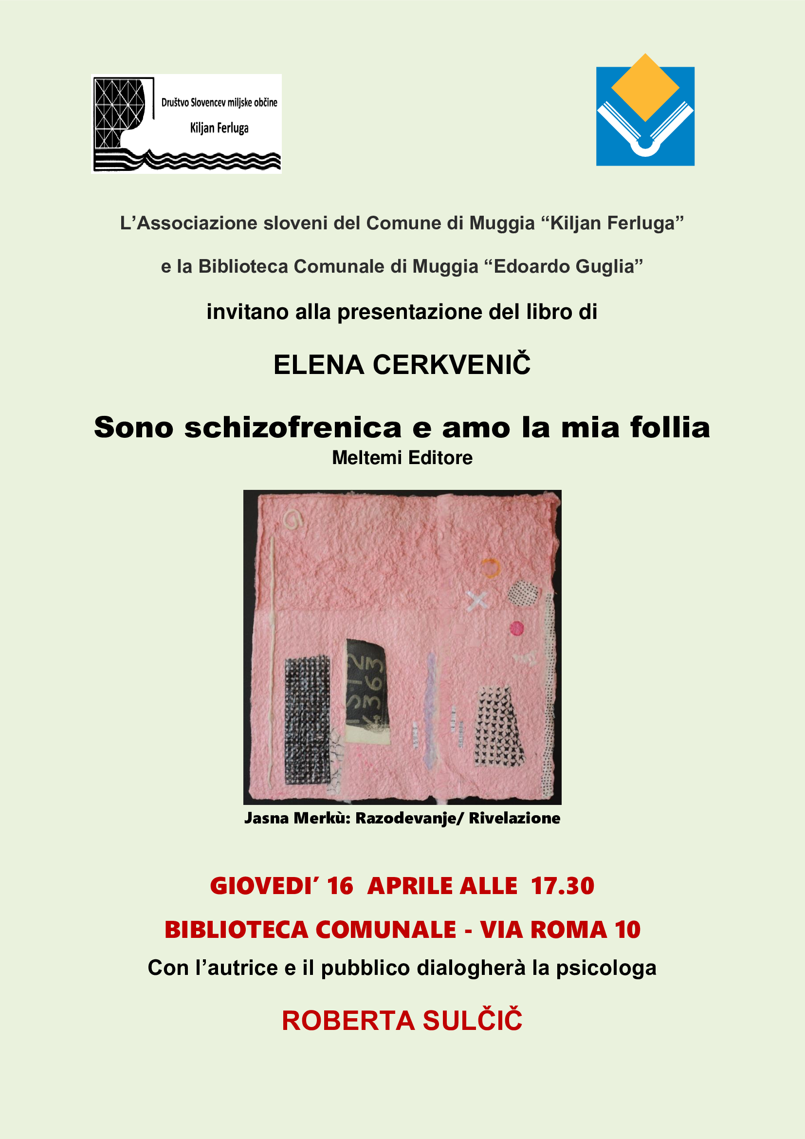 L'Associazione sloveni del Comune di Muggia "Kiljan Ferluga" e la Biblioteca Comunale di Muggia "Edoardo Guglia" invitano alla presentazione del libro di Elena Cerkvenič "Sono schizofrenica e amo la mia follia" (Meltemi Editore).