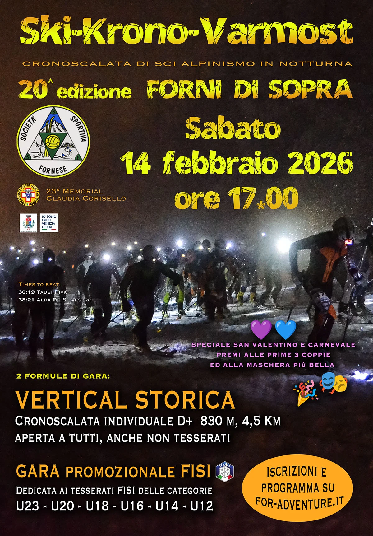 La Società Sportiva Fornese è lieta di annunciare la 20ª edizione della Ski Krono Varmost, la celebre gara di sci alpinismo in notturna.