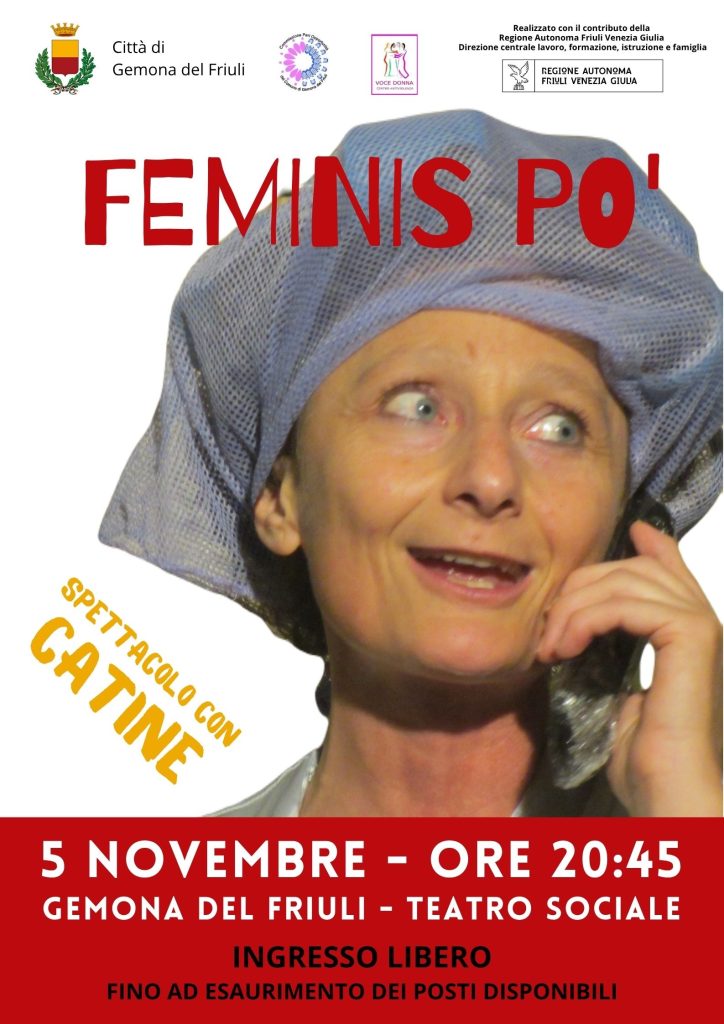 Lo spettacolo "Feminis po'" con Catine, proposto dalla Commissione Pari Opportunità, si terrà il 5 novembre alle ore 20.45 presso il Cinema Teatro Sociale.