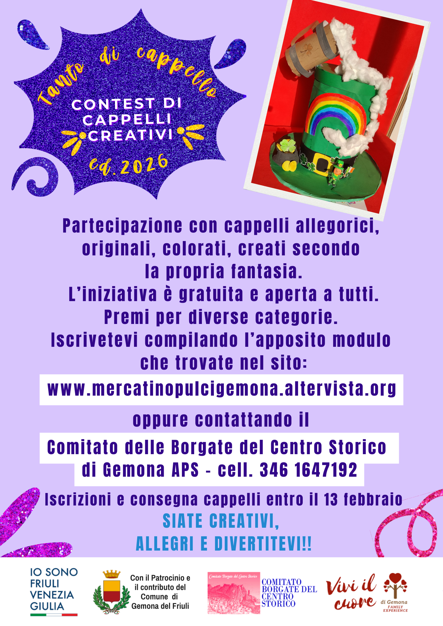 Per la gioia di tutti - bambini, ragazzi e adulti -, torna anche quest'anno il contest "Tanto di cappello", organizzato dal Comitato Borgate del Centro Storico nell’ambito del progetto di valorizzazione del territorio Vivi il cuore di Gemona – Family Experience. I partecipanti dovranno come sempre realizzare dei cappelli di qualunque tipo, lasciando sbizzarrire la loro fantasia: cappelli allegorici, originali, coloratissimi!