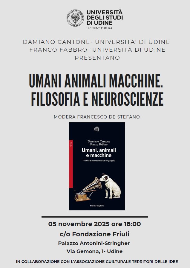 Presentazione del libro "Umani, animali e macchine. Filosofia e neuroscienze del lingaggio" di Damiano Cantone e Franco Fabbro dell'Università di Udine.