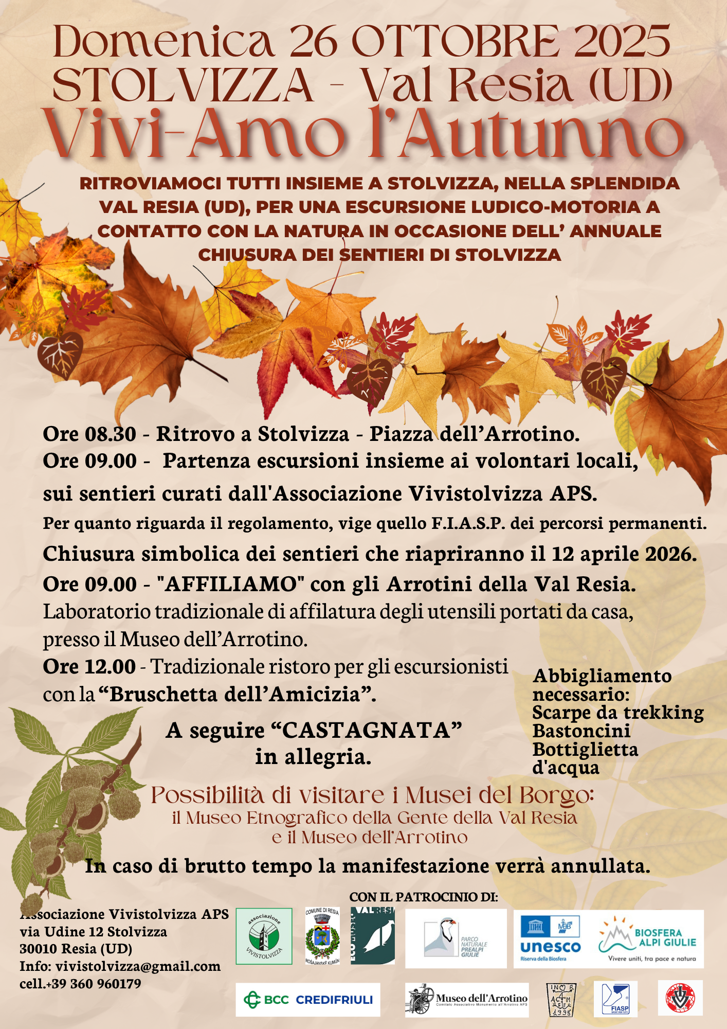 Tutto il programma di domenica 26 ottobre sarà curato dall'Associazione ViiviStolvizza" in collaborazione della Associazione CAMA Arrotini Stolvizza, del gruppo Alpini "Sella Buia" e dell’Associazione Museo della gente della Val Resia, il Patrocinio del Comune, la preziosa presenza del Parco Naturale della Prealpi Giulie e il sostegno di Credifriuli.
