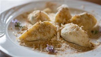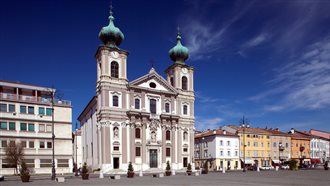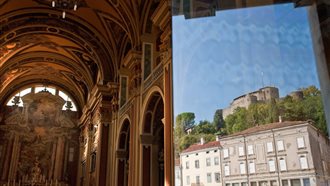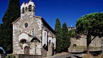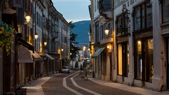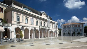 La piazza ospita lo storico teatro e una colonna in marmo su cui poggia il leone di S. Marco.