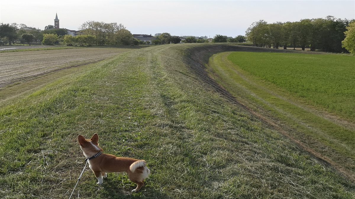 Era in una sera di Maggio, pochi giorni fa, la mia prima libera uscita dalla quarantena. Le passeggiate nel verde sono parte della ritrovata mobilità e vitalità, in quell’area fluviale vicino a casa, che un’idea progettuale voleva valorizzare nel Comune di S. Vito al Tagliamento. Ogni volta è una gioia per Tea, la mia cagnetta, protagonista di continue scoperte. Non scelgo le prime ore del mattino, né mi apposto con pazienza ad aspettare esemplari di fauna locale ricca, magari semplici caprioli, lepri, volpi, averle, o a fotografare gruccioni variopinti che qui nidificano. Vorrei aver la fortuna di far loro uno scatto, come vorrei vedere da vicino l’upupa, volatile rappresentato anche nel Teatro Gian Giacomo Arrigoni. Mi muovo nelle ore vicino al tramonto, quando la luce cambia, le ombre si allungano. Ieri ho comunque visto una coppia di caprioli scomparire veloce tra il fogliame. In campi di granoturco ho intravvisto tracce di ungulati, a tre punte. In questi giorni ho incontrato, sempre a distanza, tranquilli runner o camminatori, ciclisti, cani al guinzaglio. Mantenere distanza non è un problema. Sarà che non ci sono feste, grigliate, come per tradizione qui si faceva, sarà che la pulizia e l’ordine ora testimoniano rispetto e cura, è un piacere farsi accogliere dalla pace verde. L’erba dell’argine e dei passaggi comuni è stata falciata: dall’alto i movimenti degli attraversamenti sembrano aiuole di un giardino.
