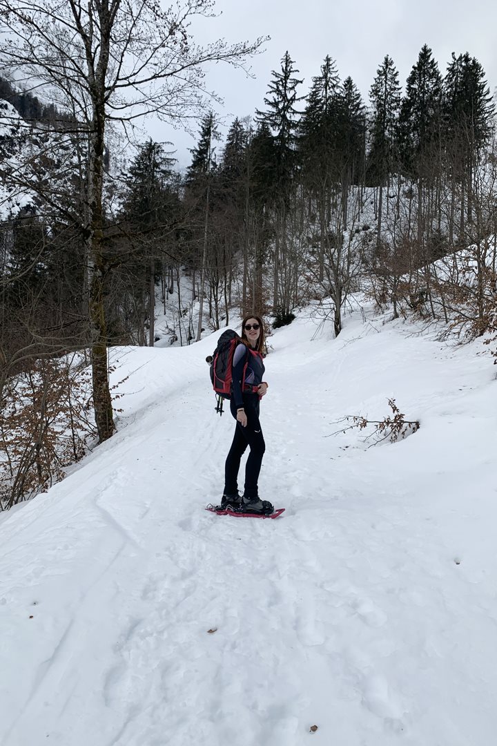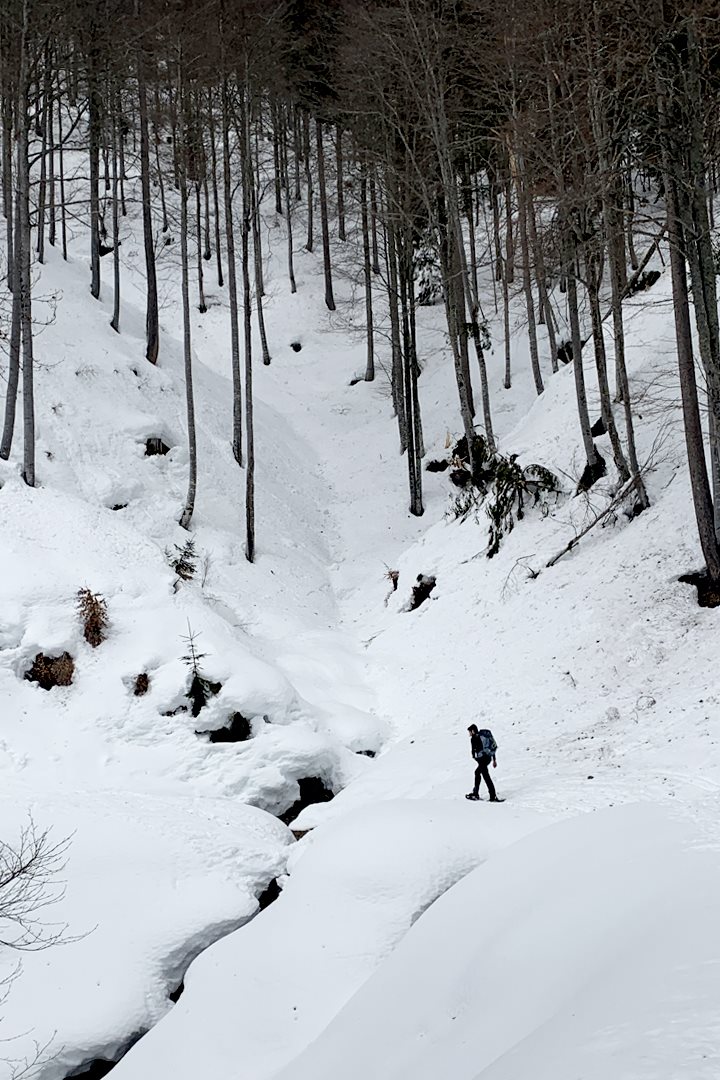 Ci immergiamo nella foresta e dopo pochi metri indossiamo già le ciaspole. Seguiremo la strada forestale ma in molti punti il sentiero CAI 607 consente di abbreviarla tagliando nel folto del bosco. Dato lo spesso manto di neve, non rischiamo e ci godiamo la vista sulla val Saisera che si fa minuscola sotto di noi.