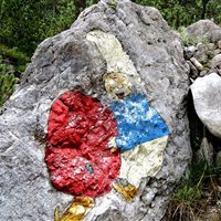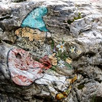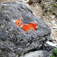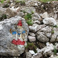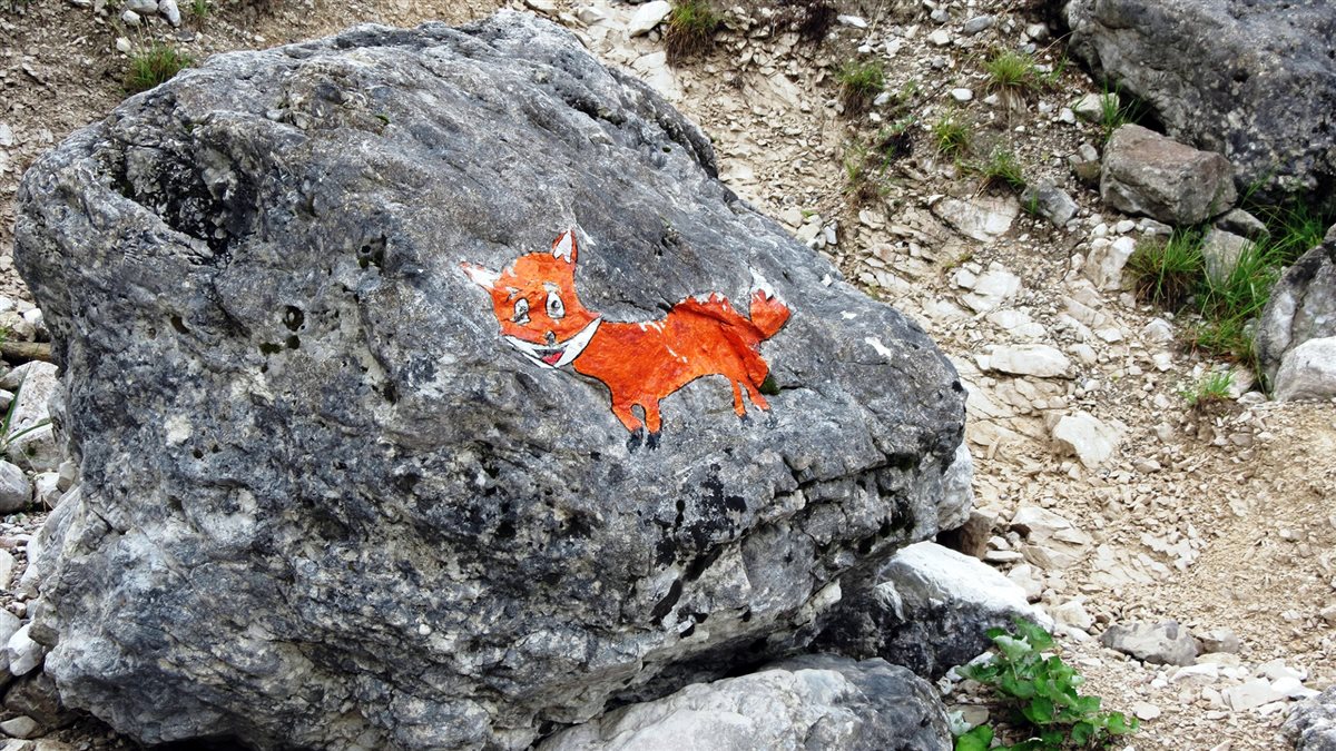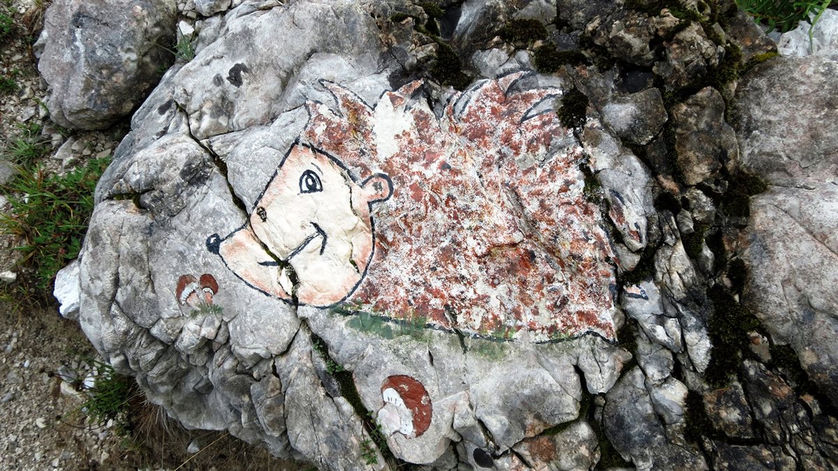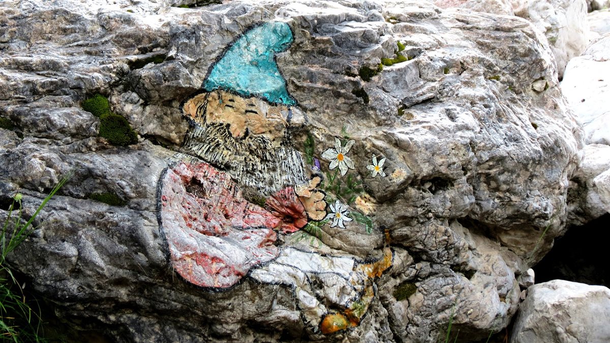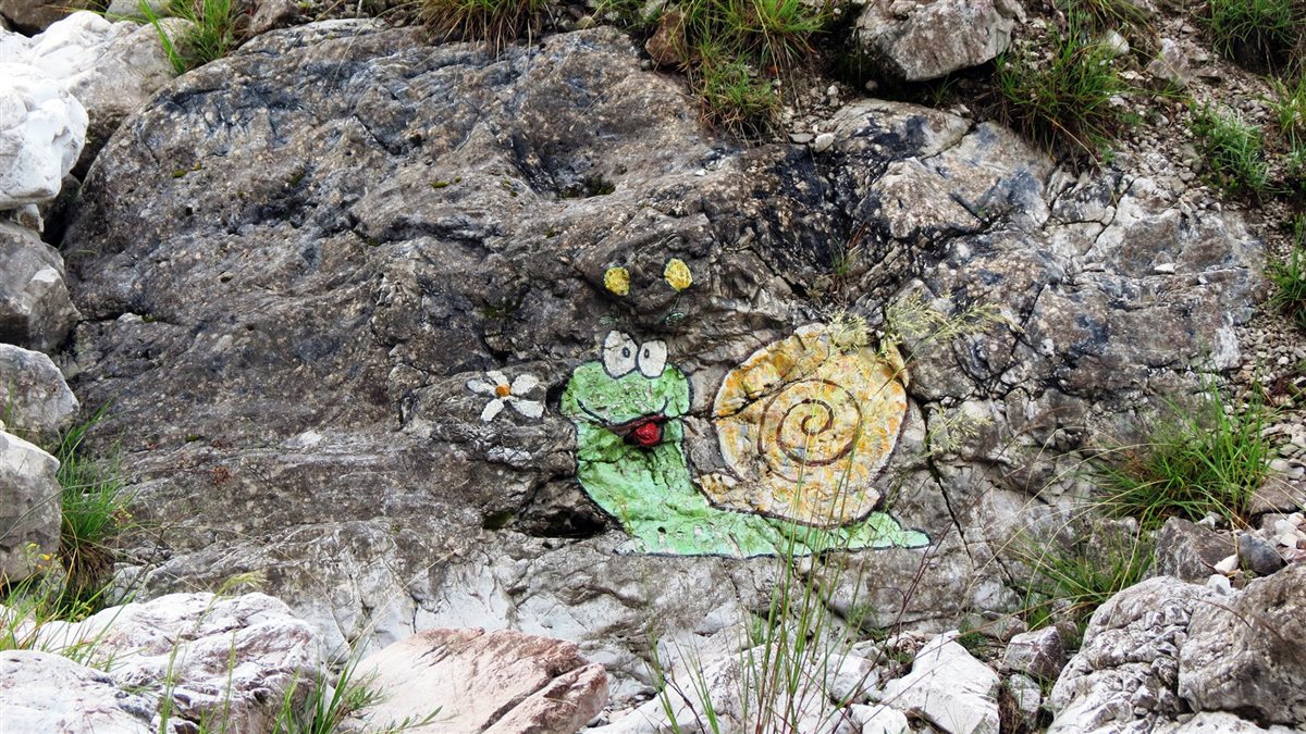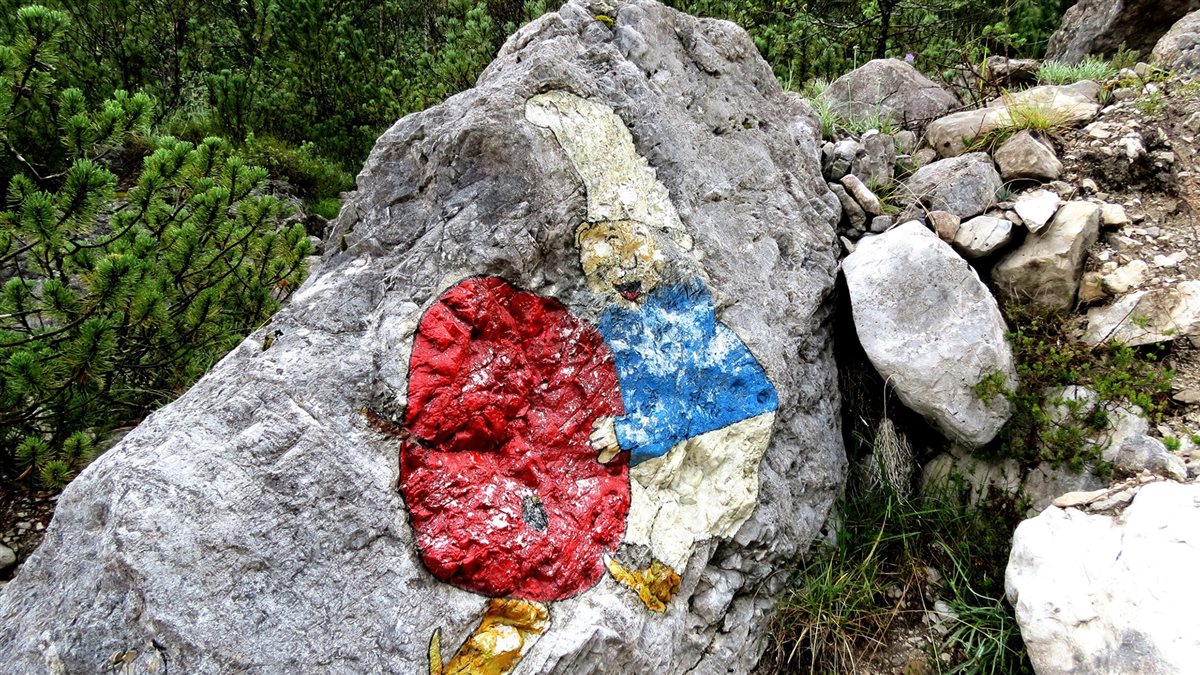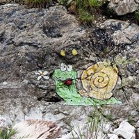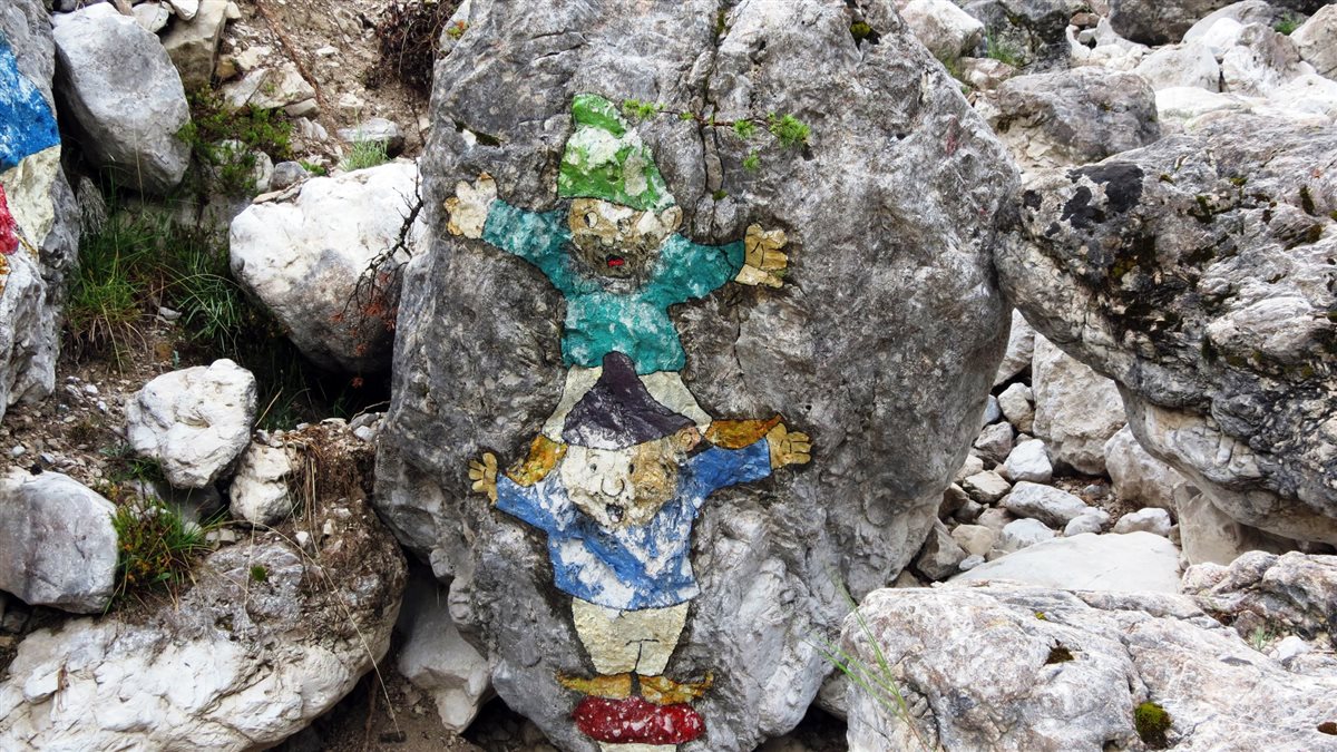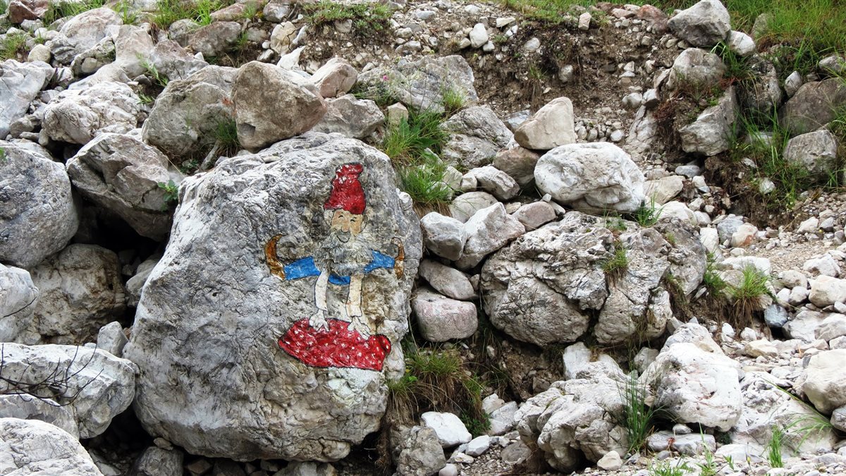 L’alba porta consiglio e quindi ho esplorato il Sentiero degli Gnomi ( alte figure fiabesche che mi hanno sempre fatto impazzire) una ex cascata e molte pietre dipinte con gnomi, rane, stelle alpine, ognuno riposa su un sasso del canalone.