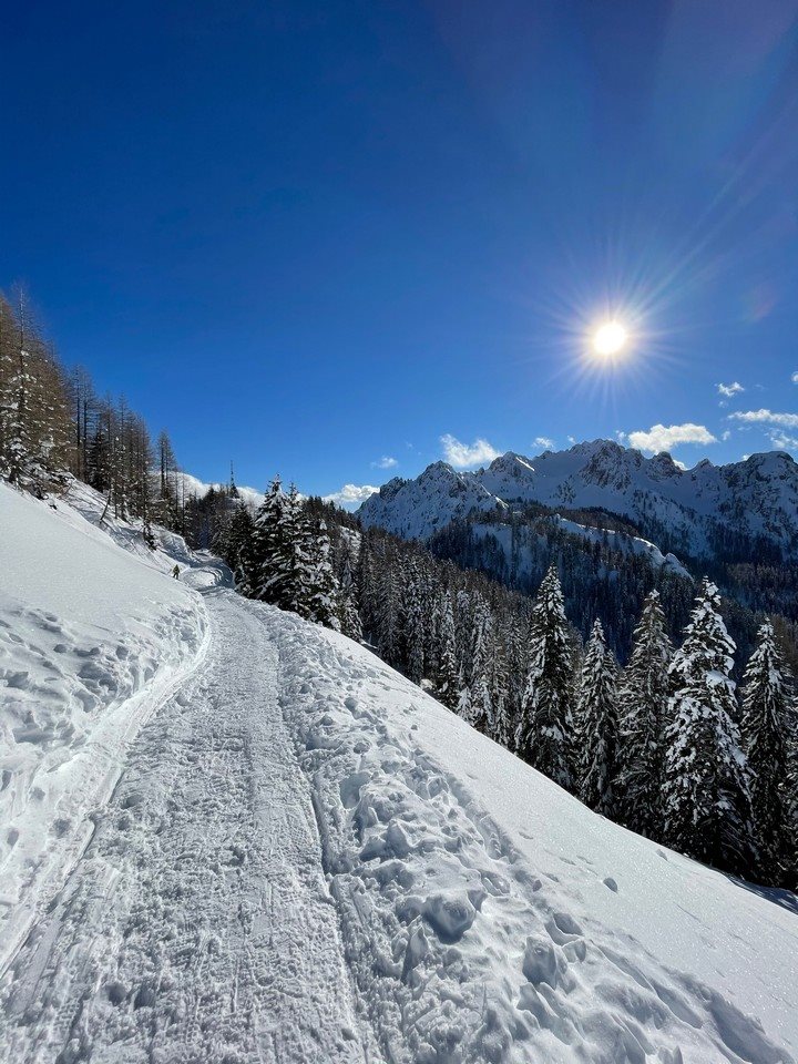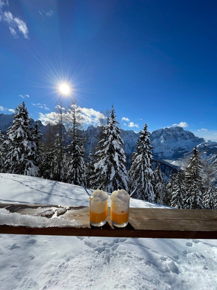 In cima l’aria è fresca e punge le guance ma il sole scalda e sembra di stare fuori dal mondo. Facciamo una passeggiata intorno al paese, c’è davvero tantissima neve (mai vista così tanta in vita mia) e alla fine ci premiamo con un bombardino vista montagne friulane e musica che fa molto tramonto a Ibiza (la perfezione).